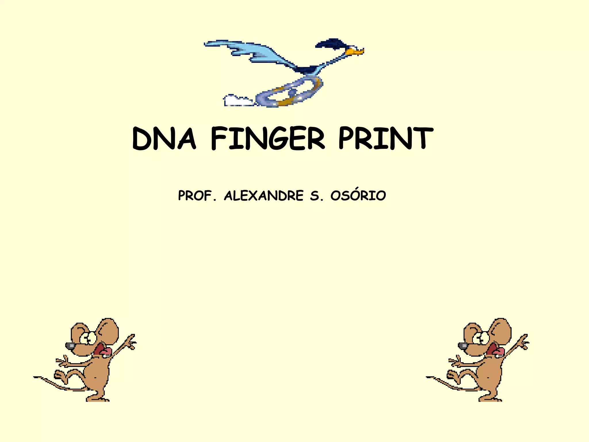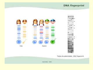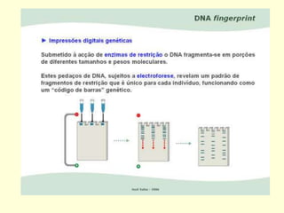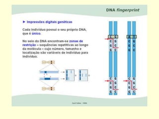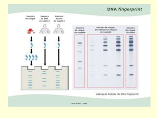O documento discute impressões digitais de DNA e técnicas como RFLP e PCR usadas para gerar perfis genéticos únicos de indivíduos. Isso é feito analisando microssatélites, sequências repetitivas de DNA, que variam entre pessoas. Esses perfis de DNA podem ser usados para identificar criminosos, vítimas e resolver casos de paternidade.