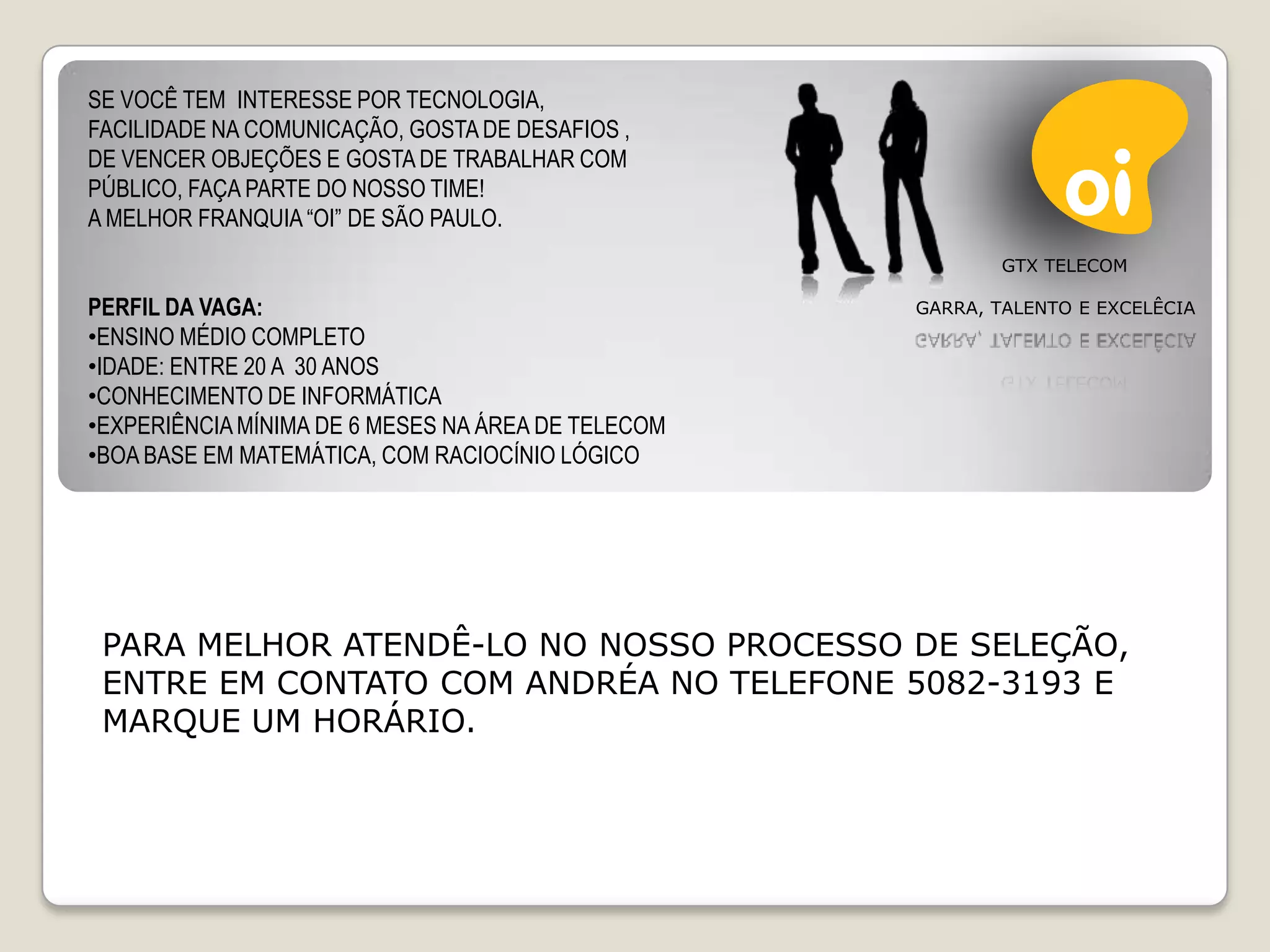 Uma empresa de telecomunicações está contratando novos funcionários. Eles procuram candidatos com interesse em tecnologia, boa comunicação, gosto por desafios, experiência de 6 meses na área de telecom e conhecimento básico de informática e matemática. Os interessados devem entrar em contato com a recrutadora Andrea para agendar uma entrevista.