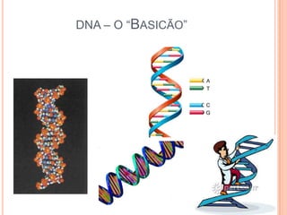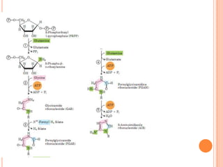 O documento descreve a estrutura e biossíntese do DNA. O DNA é formado por bases nitrogenadas, ribose e fosfato. As bases nitrogenadas são ligadas à ribose formando nucleotídeos, que são unidos por ligações fosfodiéster formando as fitas de DNA. O nitrogênio é fixado por cianobactérias e utilizado na síntese de aminoácidos que são precursores das bases nitrogenadas e outros compostos essenciais.