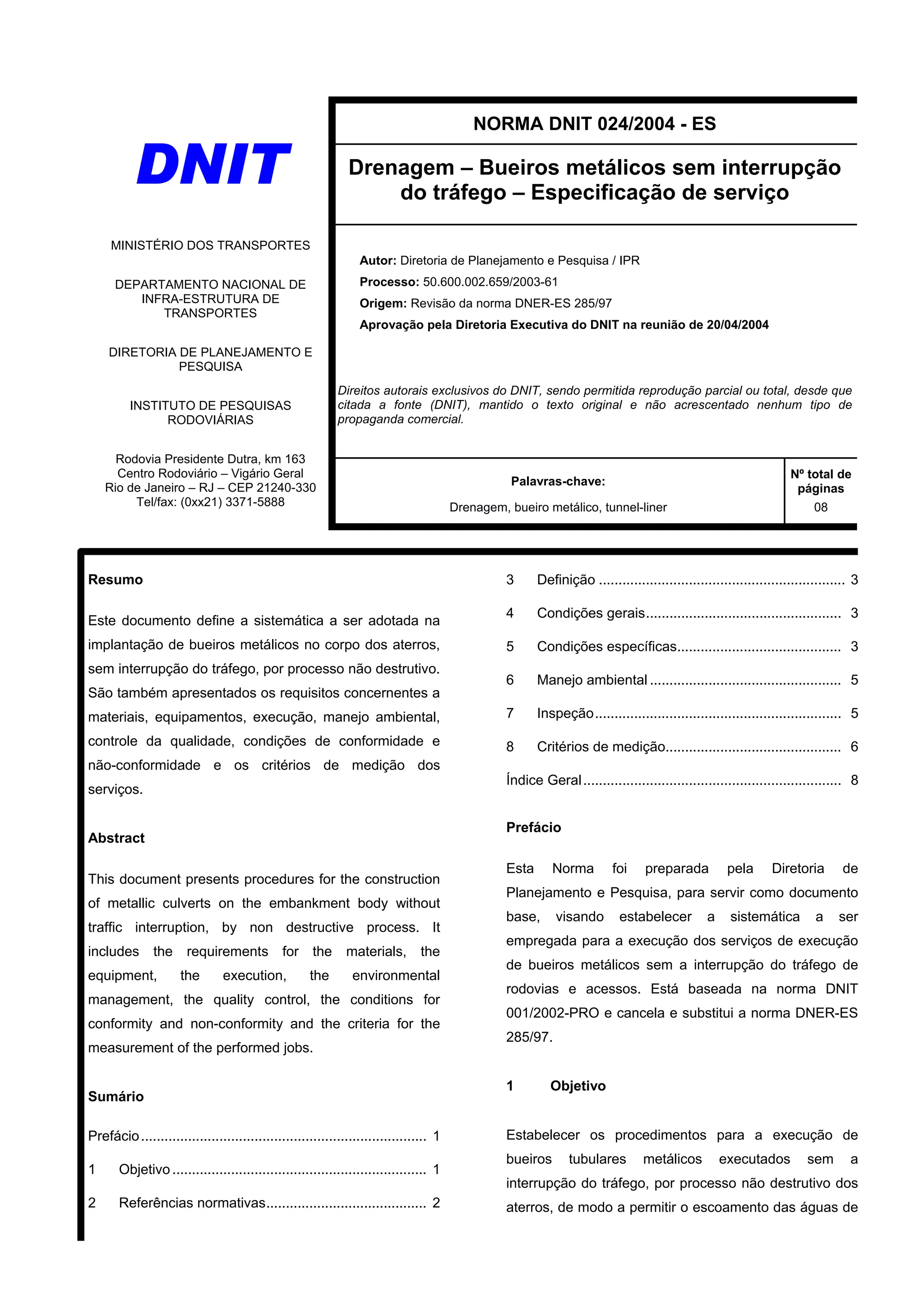 Este documento estabelece os procedimentos para a construção de bueiros metálicos em rodovias sem interromper o tráfego, utilizando o método "Tunnel-Liner". Ele define os requisitos para materiais, equipamentos, execução, controle ambiental e de qualidade para garantir a segurança e durabilidade da obra.
