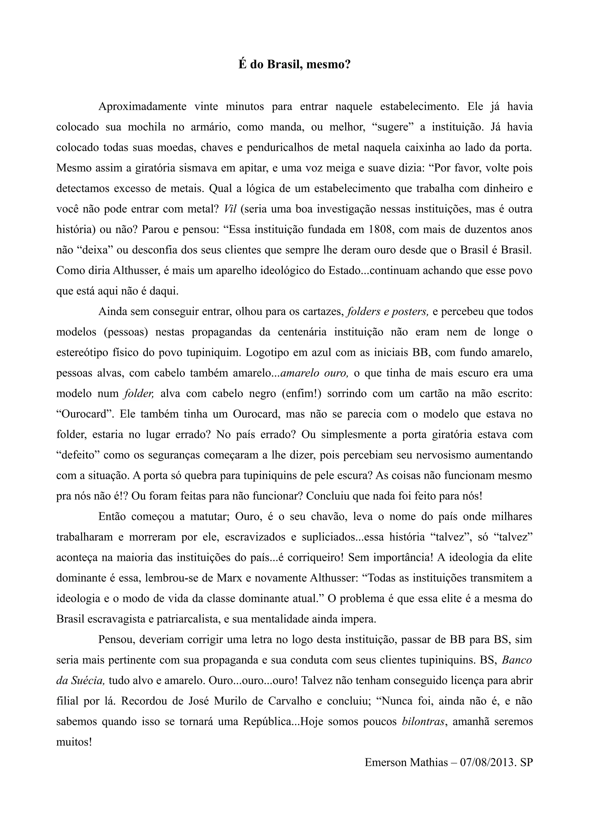 O autor esperou vinte minutos para entrar em uma instituição financeira, mas a porta giratória continuava apitando, detectando excesso de metais. Ao observar os materiais de marketing, percebeu que todos os modelos eram brancos, não representando a população brasileira. Isso levou o autor a refletir sobre como as instituições transmitem a ideologia da elite dominante e como o racismo ainda impera no Brasil.