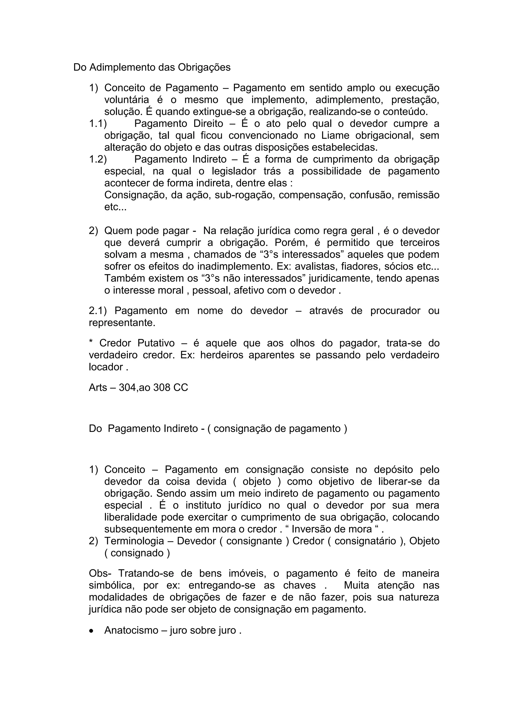 O documento descreve vários meios indiretos de pagamento de obrigações no direito brasileiro, incluindo a consignação, imputação de pagamento, dação em pagamento, confusão, compensação, novas, remissão, sub-rogação e transação. A consignação permite que o devedor deposite o valor devido para liberar-se da obrigação, enquanto a imputação permite ao devedor escolher qual dívida pagar primeiro quando deve múltiplas dívidas ao mesmo credor. A transação permite às part