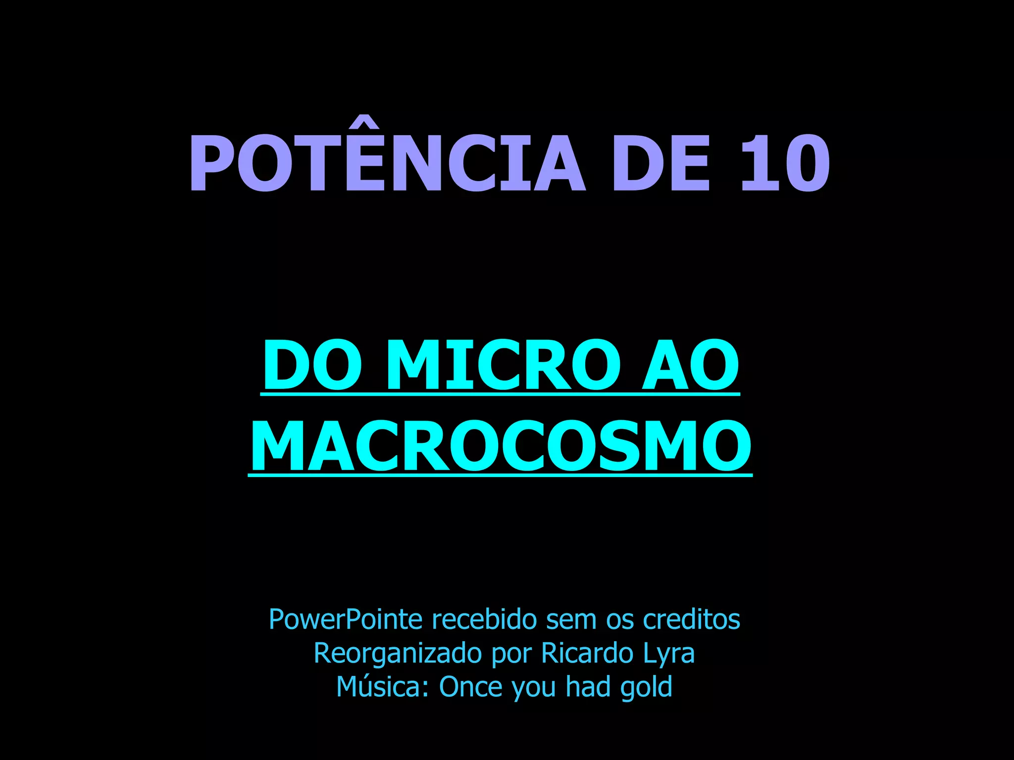 O documento descreve uma viagem imaginária através de escalas de distância em potências de 10, indo do microcosmo ao macrocosmo. Começa no nível de um metro e vai aumentando até 23 potências de 10, quando se vê galáxias distantes. Depois retorna rapidamente à Terra e continua para dentro da matéria, diminuindo a escala até 16 potências de 10, quando se vê partículas quarks. Reflete sobre como as leis são constantes em todas as escalas e sobre os limites do conhecimento humano.