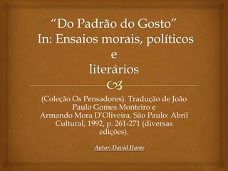 David Hume questiona a possibilidade de universalidade do gosto e aponta que o gosto é muito variado entre os indivíduos. Segundo Hume, a beleza não está no objeto em si, mas no sentimento subjetivo de quem contempla a obra. Portanto, não é possível estabelecer um padrão universal de gosto ou beleza, dado a multiplicidade de sentimentos e opiniões existentes sobre o assunto.