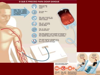 A doação de sangue requer que os doadores tenham entre 18-65 anos, pesem mais de 50kg, e respeitem intervalos entre doações. Vários testes são realizados no sangue doado para garantir sua segurança, incluindo tipagem sanguínea, testes para hepatite, HIV e outras doenças. Os doadores de sangue podem faltar ao trabalho um dia por ano sem penalizações.