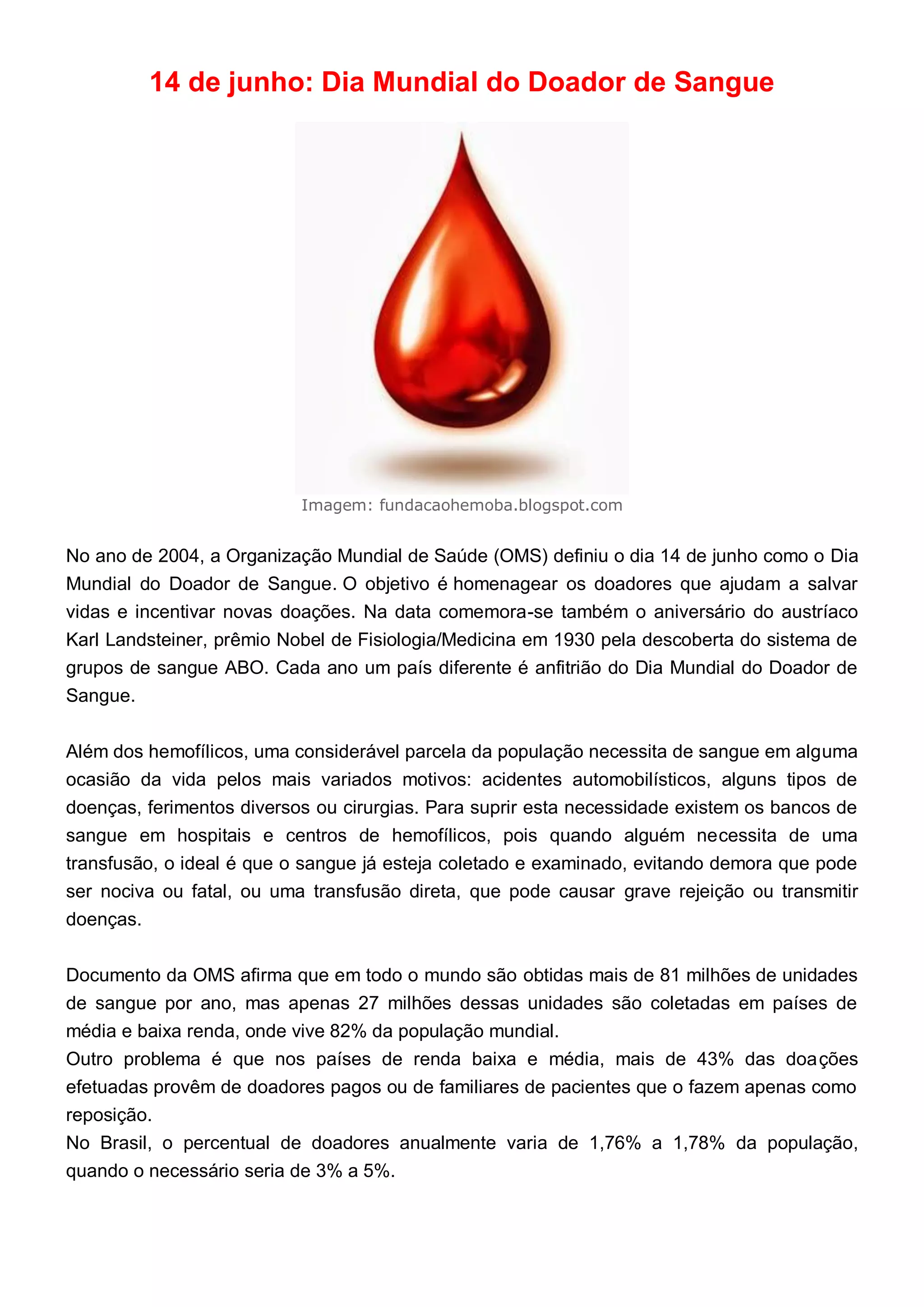 O documento discute a importância da doação de sangue, destacando que 14 de junho é o Dia Mundial do Doador de Sangue. Também aborda os requisitos para doação, a história das transfusões de sangue, e alguns recordes de doação ao redor do mundo.