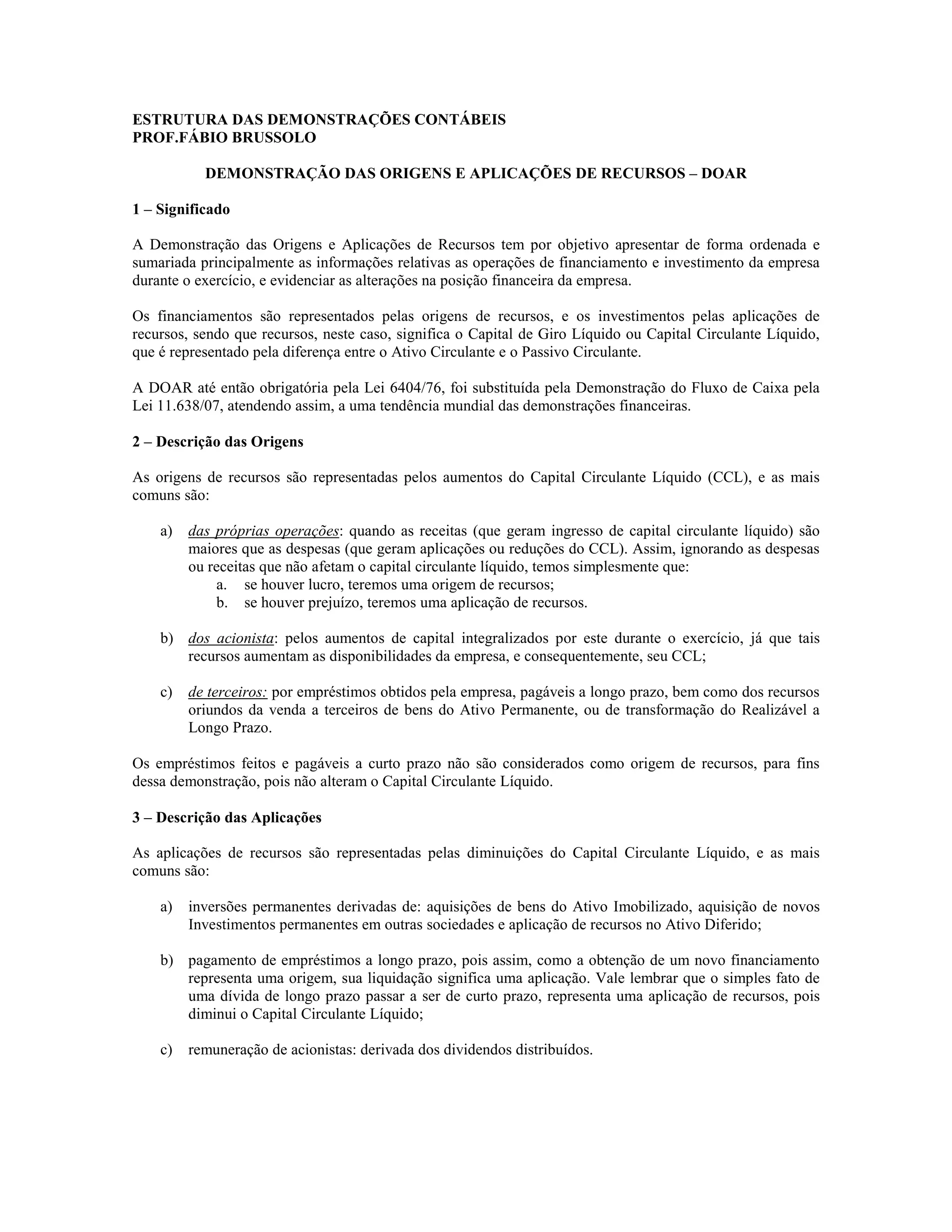 O documento descreve a Demonstração das Origens e Aplicações de Recursos (DOAR), que apresenta as informações sobre financiamento e investimento de uma empresa. A DOAR mostra as origens (financiamentos) e aplicações (investimentos) de recursos, representados pelo Capital Circulante Líquido. Ela foi substituída pela Demonstração do Fluxo de Caixa.