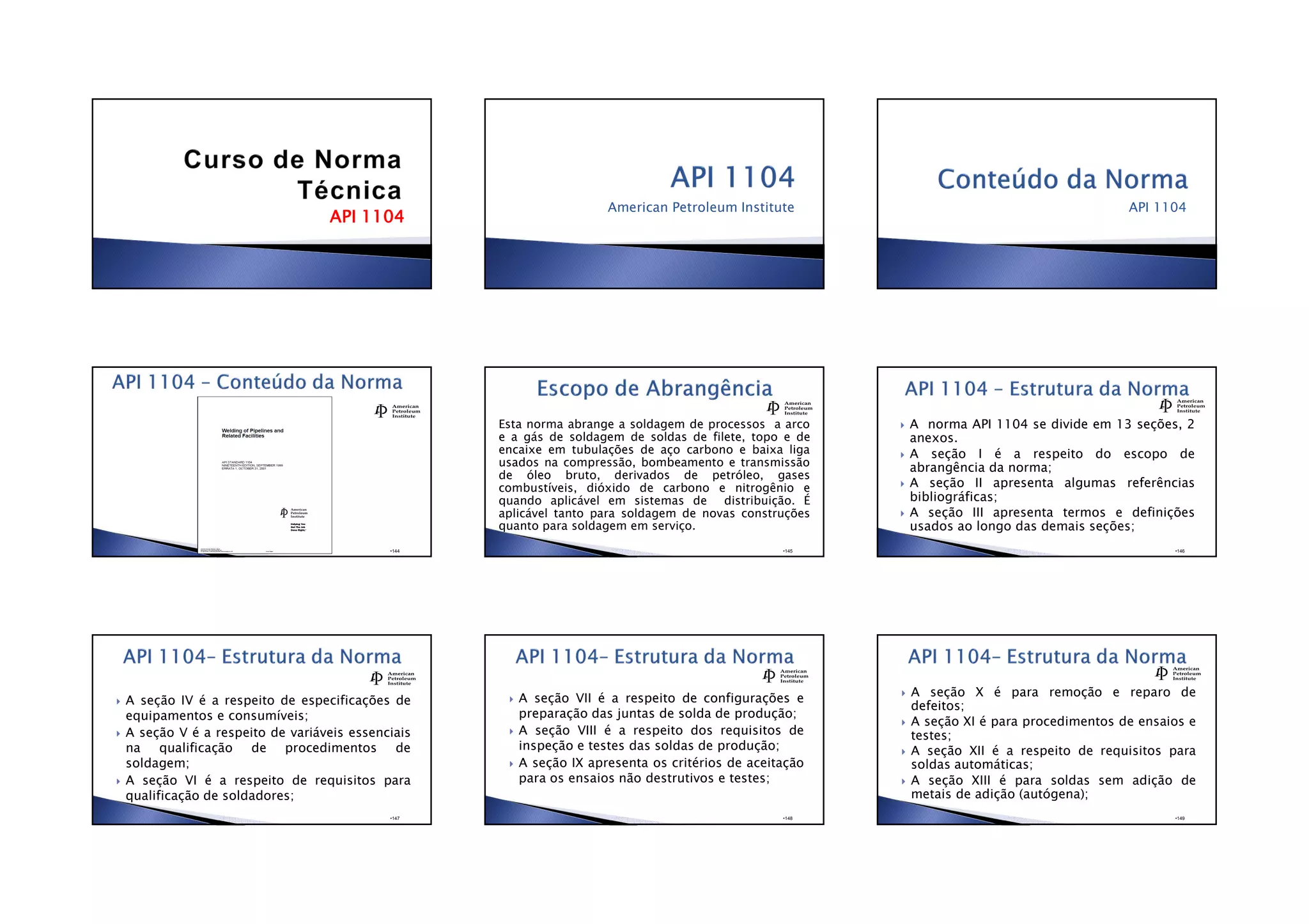 Este documento resume os principais requisitos da norma API 1104 para soldagem em tubulações de aço. A norma estabelece requisitos para qualificação de procedimentos e soldadores, preparação de juntas, inspeção e testes de soldas. É dividida em seções que tratam de equipamentos, variáveis para qualificação, configuração de juntas, ensaios não destrutivos e critérios de aceitação.