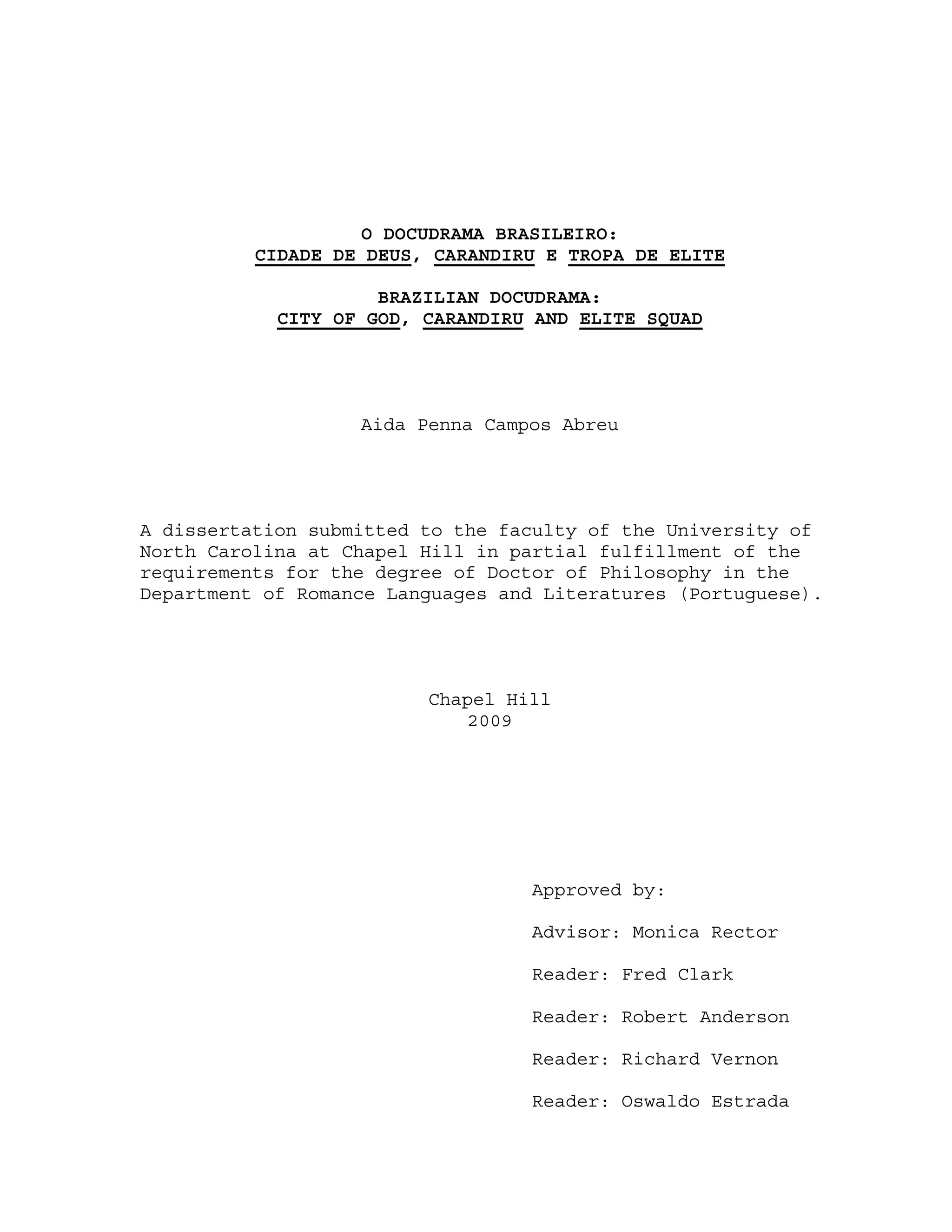 Este documento apresenta um resumo da dissertação de doutorado de Aida Penna Campos Abreu sobre os filmes brasileiros Cidade de Deus, Carandiru e Tropa de Elite como exemplos do gênero docudrama no cinema brasileiro. A dissertação analisa como esses filmes usam características do documentário de representação social misturadas com ficção para retratar eventos históricos e sociais do Brasil de forma a contribuir para uma nova interpretação e representação da realidade brasileira.