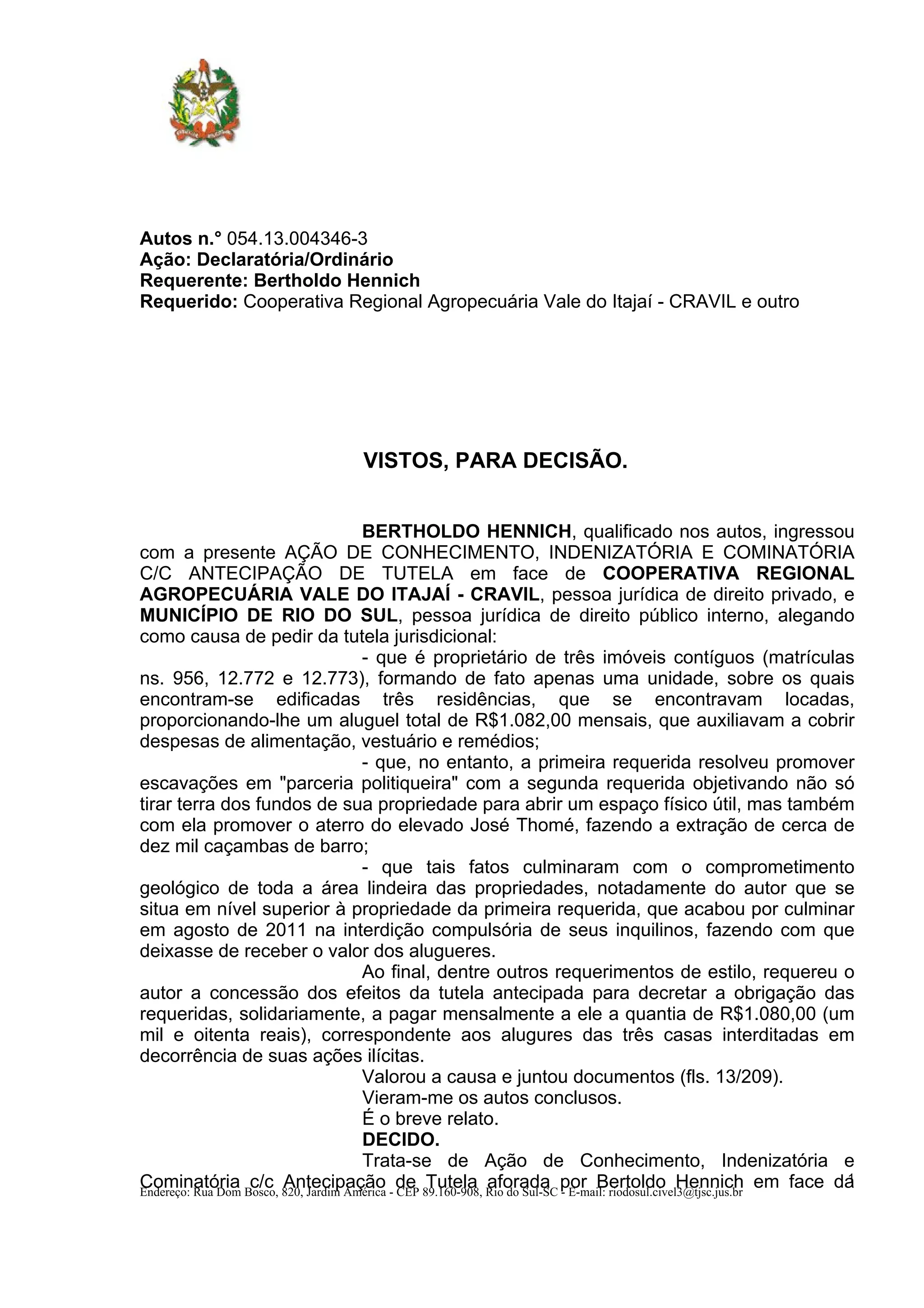 Bertoldo Hennich moveu uma ação contra a Cooperativa Regional Agropecuária Vale do Itajaí e o Município de Rio do Sul alegando que obras realizadas por eles comprometeram a estrutura geológica de suas propriedades, forçando a interdição de três casas alugadas. O juiz deferiu a antecipação da tutela, determinando que a Cooperativa pague mensalmente os alugueis das casas ao autor até a solução final do caso.