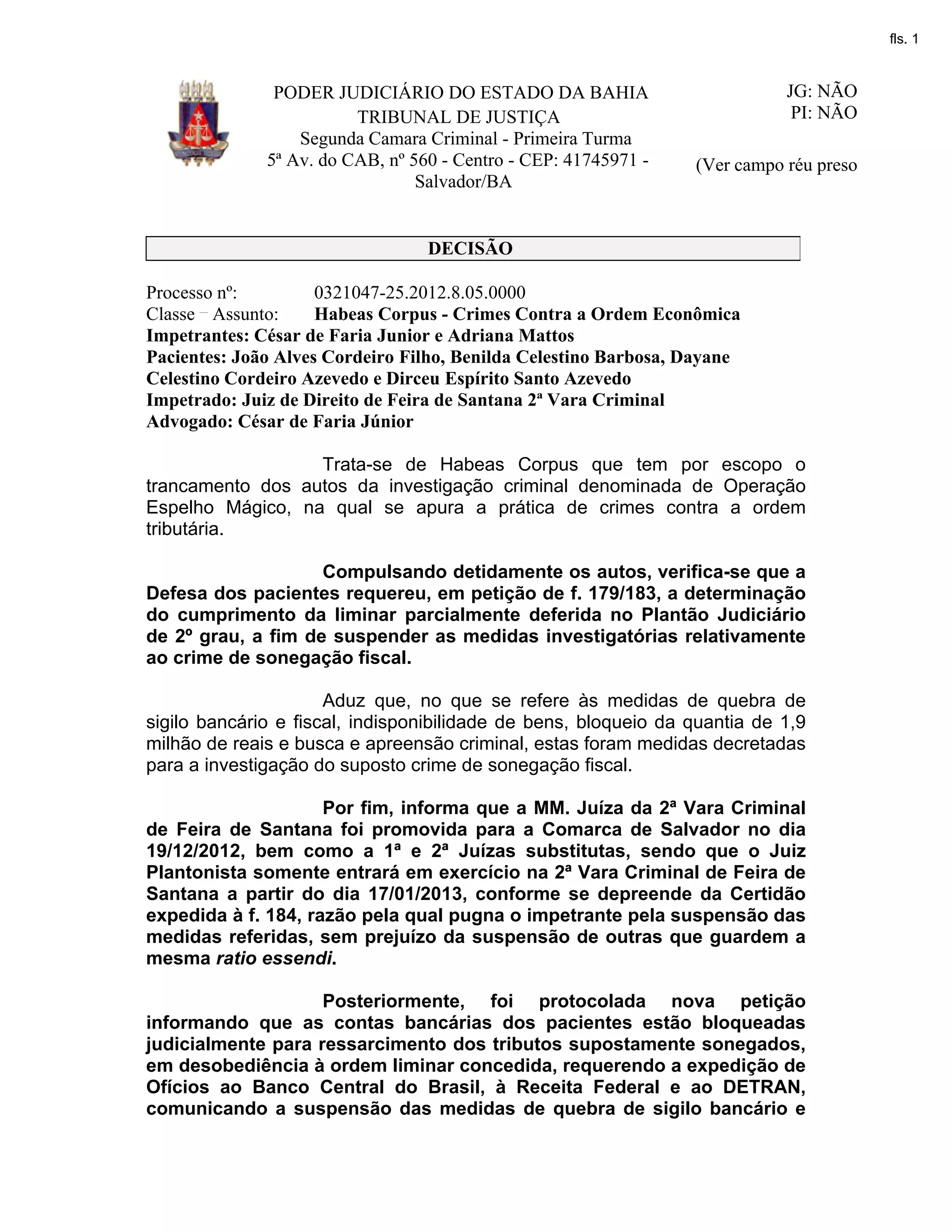 Este documento é uma decisão judicial sobre um pedido de habeas corpus para suspender medidas de investigação criminal relacionadas à sonegação fiscal. A decisão mantém a suspensão parcial concedida anteriormente, determinando que apenas as medidas relacionadas exclusivamente à sonegação fiscal devem ser suspensas, e ordena o desbloqueio das contas bancárias dos pacientes.