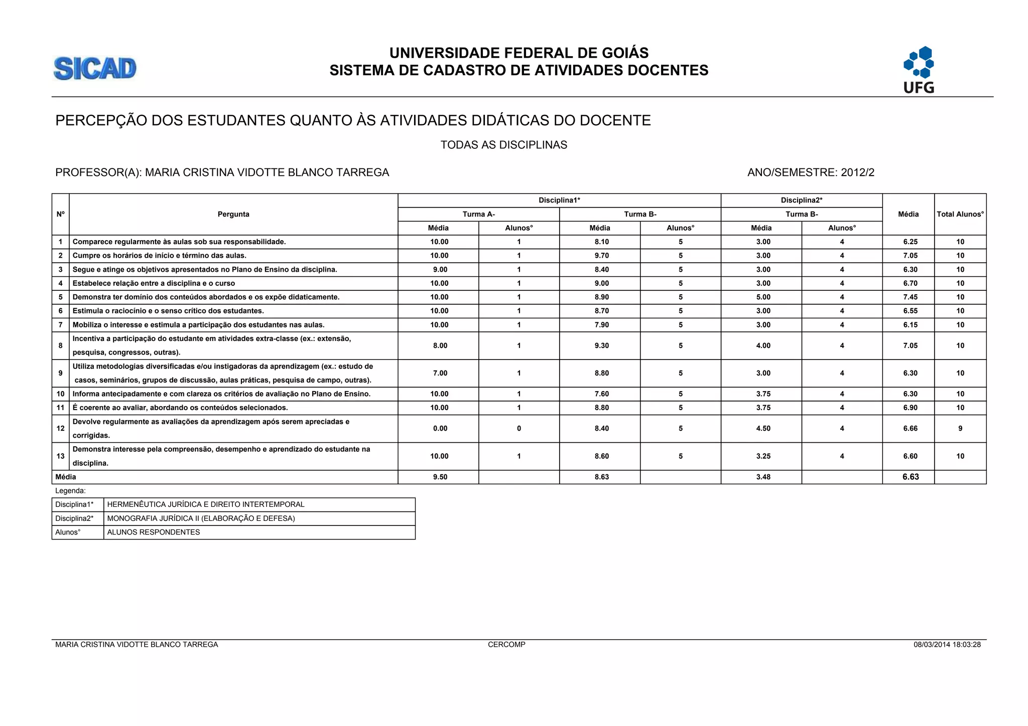 Este documento apresenta os resultados de uma pesquisa de percepção de estudantes sobre as atividades didáticas de uma professora em duas disciplinas. As notas médias dos estudantes variaram de 3.48 a 9.5 em uma escala de 0 a 10, dependendo da disciplina e turma. A professora recebeu as melhores avaliações na Disciplina 1 da Turma A.