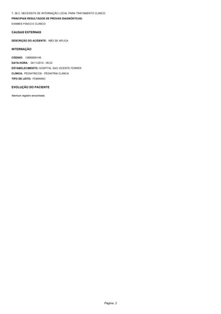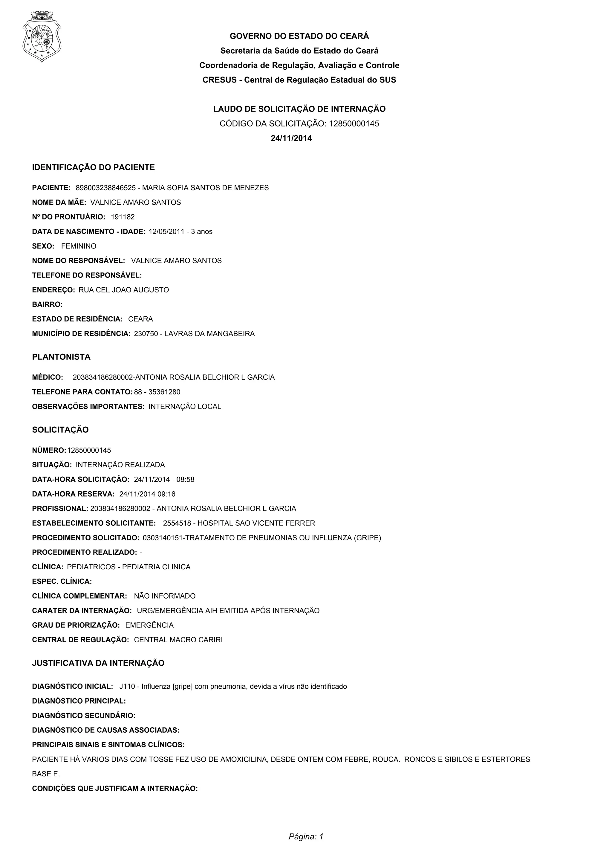 Este documento resume a solicitação de internação hospitalar de Maria Sofia Santos de Menezes, de 3 anos, feita pela médica Antônia Rosália Belchior em 24 de novembro de 2014. Maria Sofia apresentava febre, tosse e sintomas respiratórios há alguns dias e necessitava internação no Hospital São Vicente Ferrer para tratamento de pneumonia provavelmente causada por influenza.