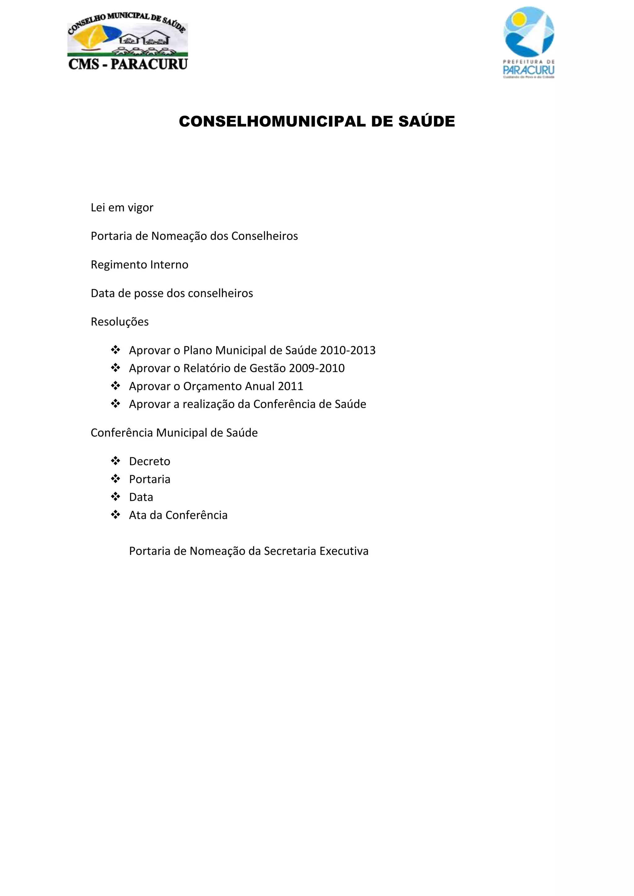 O documento descreve as informações sobre o Conselho Municipal de Saúde, incluindo a lei que o rege, a nomeação dos conselheiros, o regimento interno, a data de posse dos conselheiros, e as resoluções aprovadas. Também menciona a Conferência Municipal de Saúde com detalhes sobre o decreto, portaria, data e ata da conferência, além da nomeação da secretaria executiva.