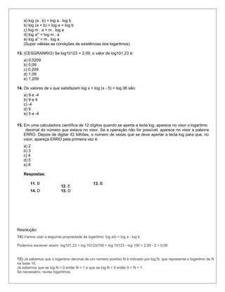 3) A resolução dos exercícios envolve propriedades dos logaritmos e cálculos numéricos.