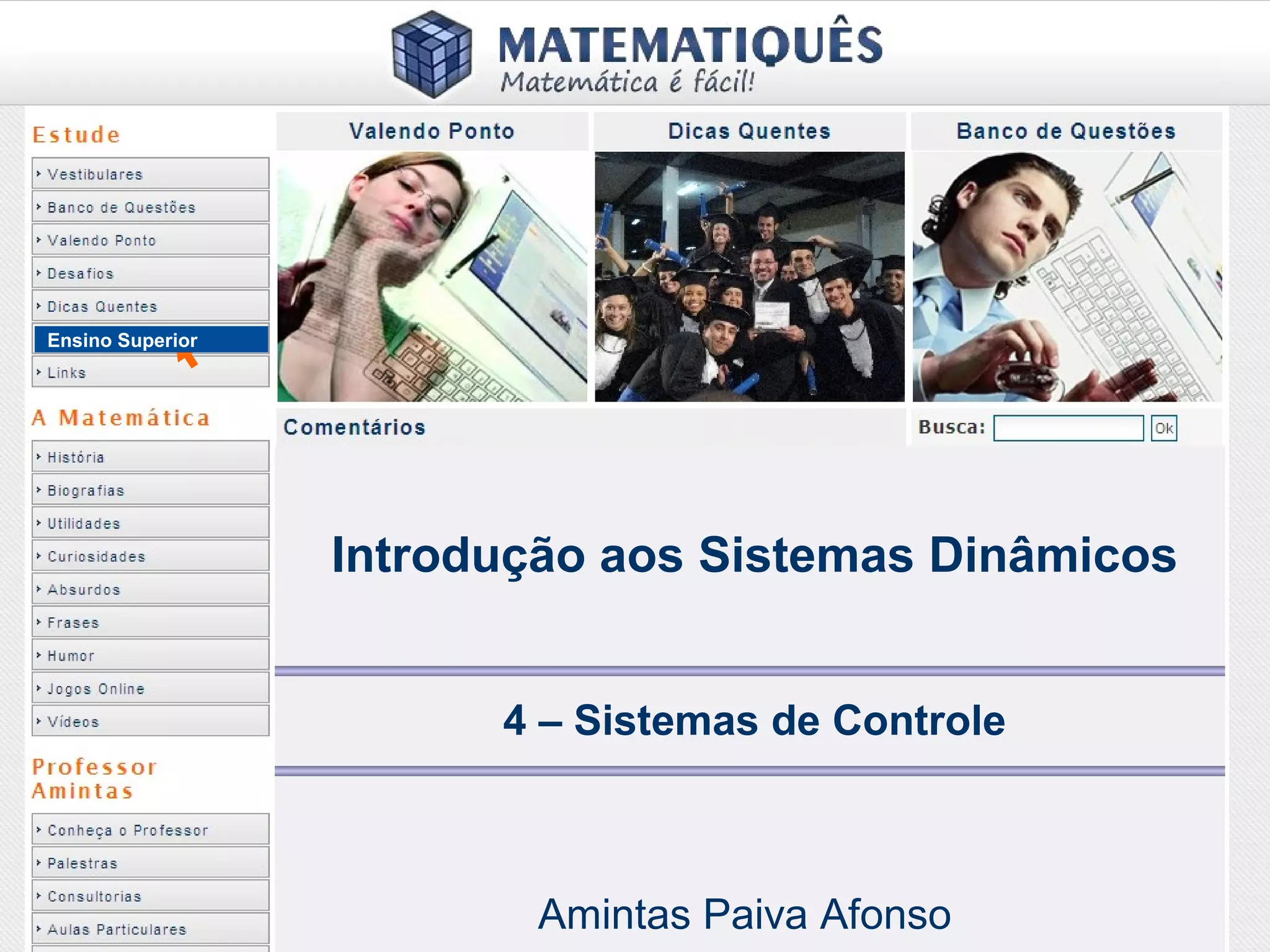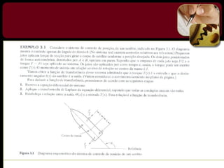 O documento discute sistemas de controle e fornece exemplos de diferentes tipos de sistemas, incluindo mecânicos, elétricos, fluídicos e térmicos. Apresenta conceitos-chave como modelo matemático, sistema linear, função de transferência e transformada de Laplace. Fornece exemplos de resolução de exercícios envolvendo sistemas mecânicos e elétricos.