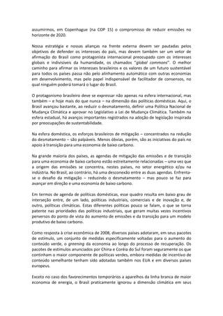 O documento discute a agenda brasileira para a conferência Rio+20 e as políticas domésticas para o desenvolvimento sustentável. Argumenta-se que a Rio+20 é uma oportunidade para avançar as negociações climáticas e que o Brasil deve atuar como protagonista nessas negociações e adotar políticas públicas coordenadas para uma transição para uma economia de baixo carbono.