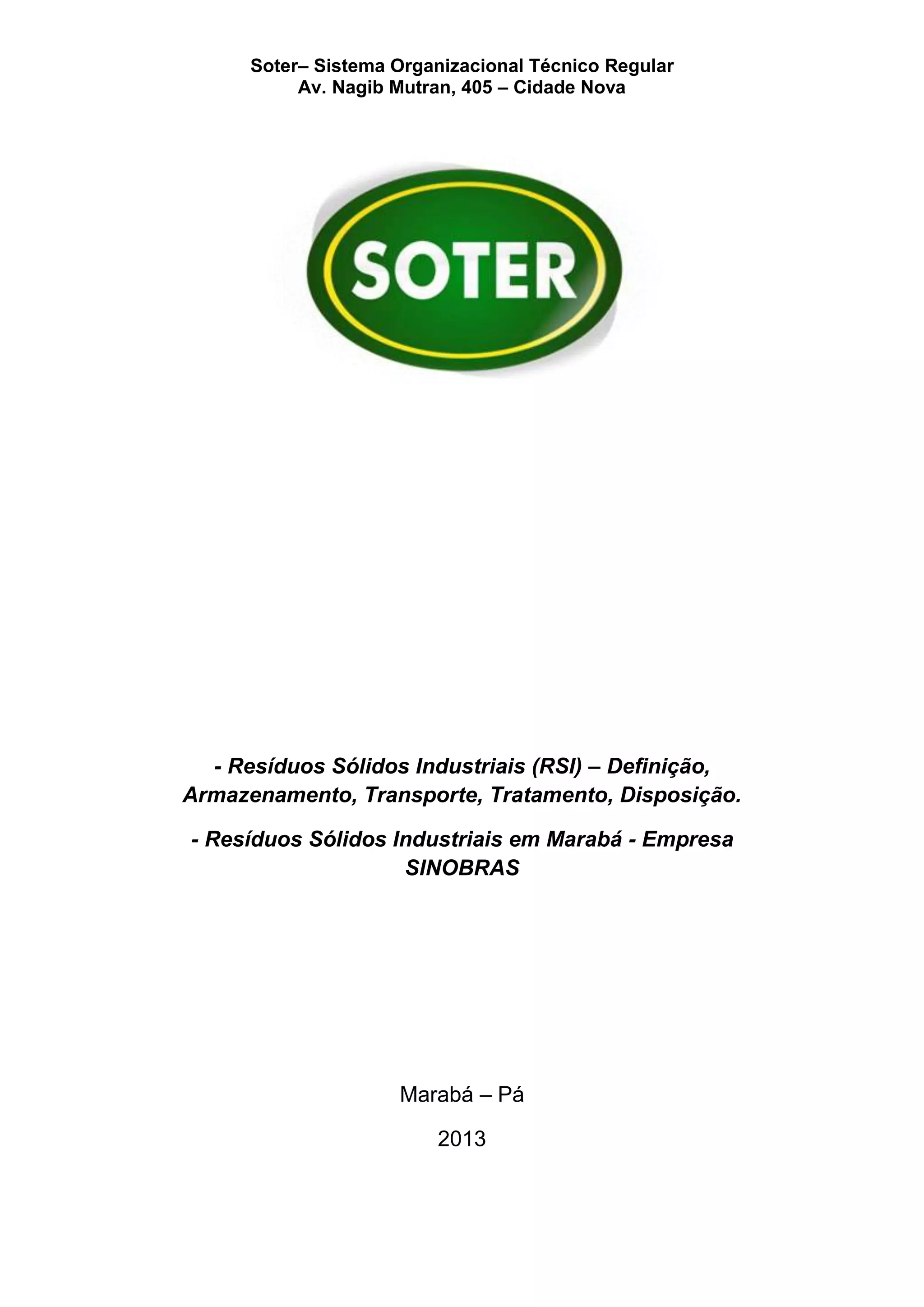 Este documento discute os resíduos sólidos industriais (RSI) gerados pela empresa Sinobras em Marabá, Pará. Ele define RSI, classifica-os e descreve como eles são armazenados, transportados, tratados e descartados. Também detalha os esforços da Sinobras para tratar resíduos perigosos, água e energia de forma sustentável.