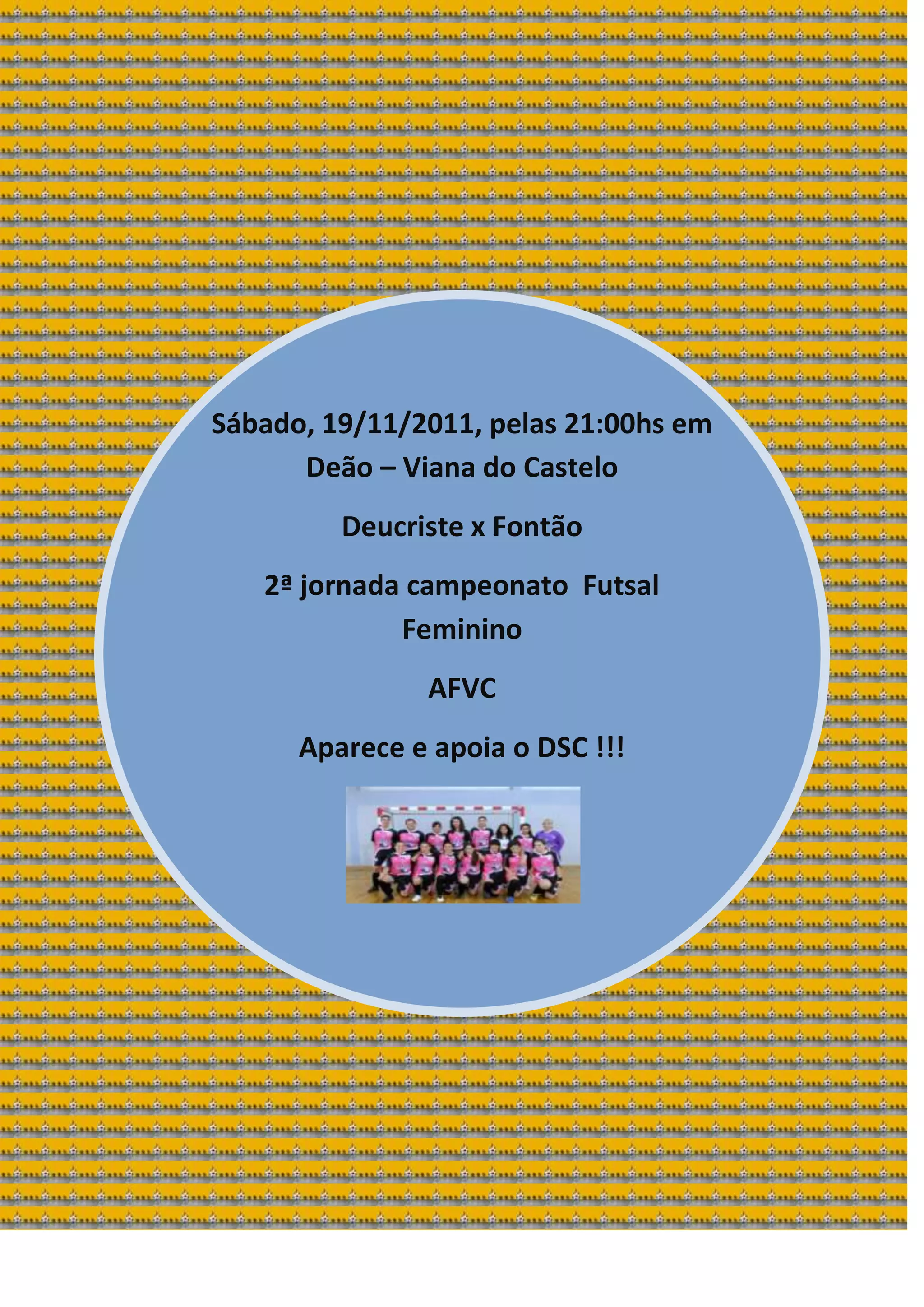 O jogo de futsal feminino entre Deucriste x Fontão acontecerá no sábado, 19 de novembro de 2011 às 21:00 horas em Deão, Viana do Castelo, pela segunda jornada do campeonato da Associação de Futebol de Viana do Castelo.