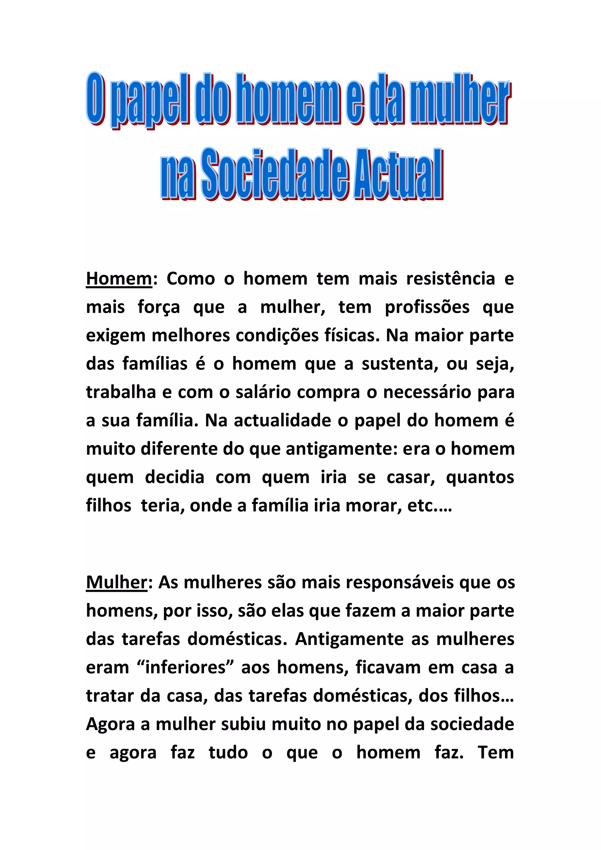 O documento discute as diferenças de gênero no trabalho e nos papéis domésticos. Afirma que os homens têm mais força física e sustentam financeiramente a maioria das famílias, enquanto as mulheres são mais responsáveis e realizam a maior parte das tarefas domésticas. Embora os papéis tenham mudado, com as mulheres assumindo mais profissões antes reservadas aos homens.