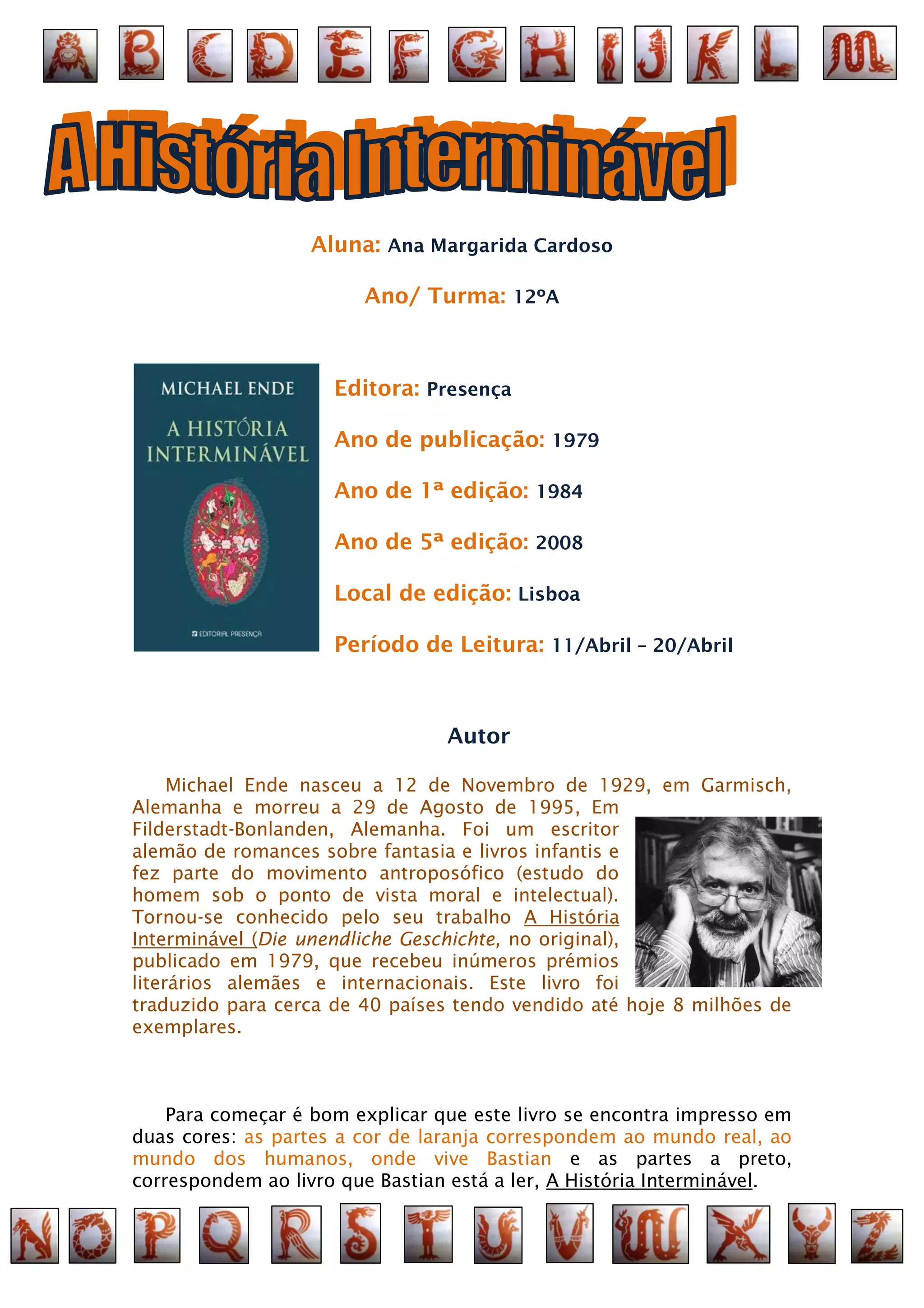 O documento resume o enredo do livro "A História Interminável" de Michael Ende. Conta a história de Bastian, um menino que rouba e lê este livro e acaba por entrar no mundo de fantasia nele descrito, onde ajuda a imperatriz criança doente dando-lhe um novo nome. Descreve as aventuras de Bastian e do herói Atreiú em fantasia e como Bastian usa a sua imaginação para criar e alterar este mundo, até aprender a importância das suas ações.