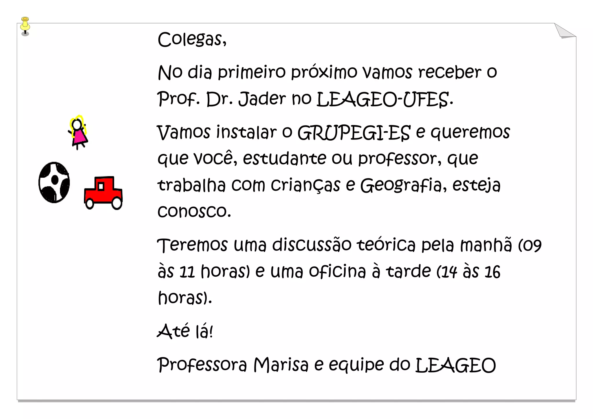 O documento convida estudantes e professores a participarem de uma discussão teórica pela manhã e uma oficina à tarde sobre a instalação do GRUPEGI-ES no LEAGEO-UFES com a presença do Prof. Dr. Jader. A manhã inclui a apresentação do grupo, proposta de formação do grupo de pesquisa, organização do calendário de reuniões e distribuição de funções. À tarde haverá uma oficina sobre mapas vivenciais ministrada pelo Prof. Jader.