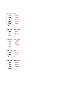 O documento apresenta as taxas de sucesso dos alunos em diferentes disciplinas entre os anos letivos de 2003/2004 a 2010/2011, bem como as taxas de sucesso esperadas no projeto educativo da escola. As taxas de sucesso foram geralmente altas, variando entre 85-100%, com poucas exceções abaixo de 90%.