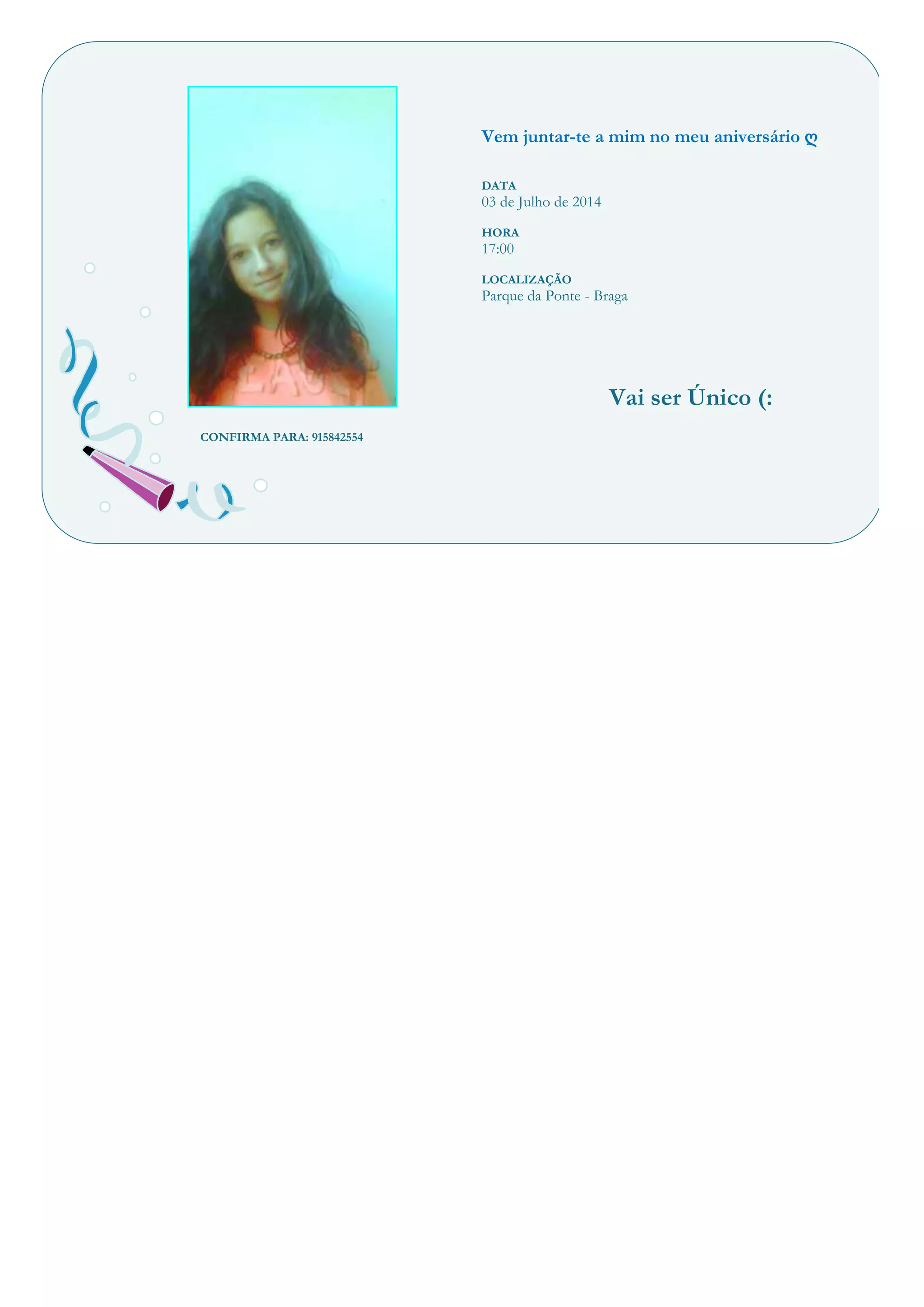 Um convite para uma festa de aniversário no dia 3 de julho às 17h no Parque da Ponte em Braga, Portugal. O convite pede para confirmar presença no número de telefone 915842554.