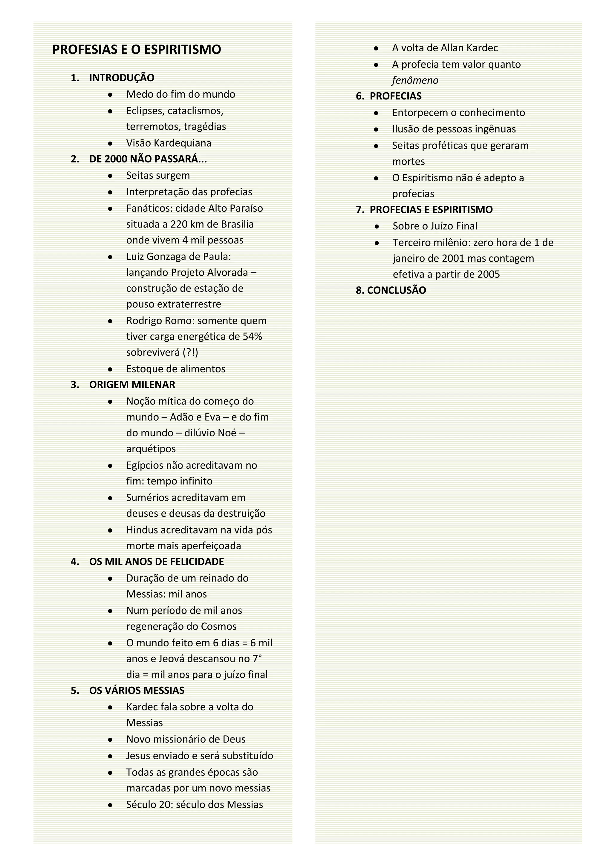 O documento discute as origens e interpretações das profecias sobre o fim do mundo. Primeiramente, aborda como seitas surgiram com interpretações errôneas sobre o fim do mundo em 2000. Em seguida, explica que profecias podem iludir pessoas ingênuas, mas o Espiritismo não apoia profecias. Por fim, conclui que o Espiritismo não faz previsões sobre o Juízo Final.