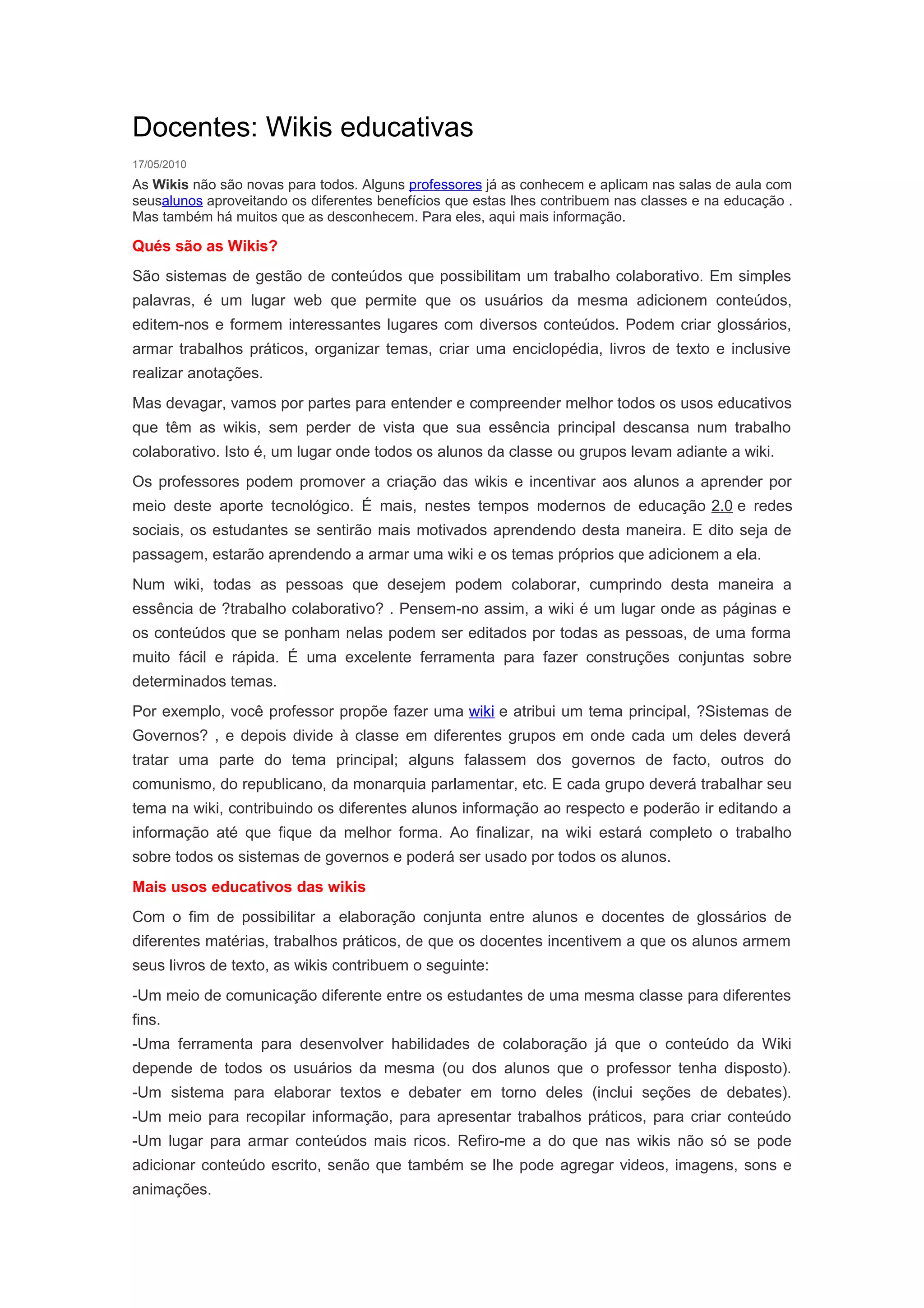 Este documento descreve o que são wikis educativas e seus benefícios potenciais no ensino. Wikis são sistemas online que permitem a colaboração de estudantes na criação e edição de conteúdo. Isso pode incluir glossários, trabalhos práticos, livros didáticos e debates. Wikis incentivam habilidades colaborativas e motivam estudantes ao aprenderem de forma moderna e social.