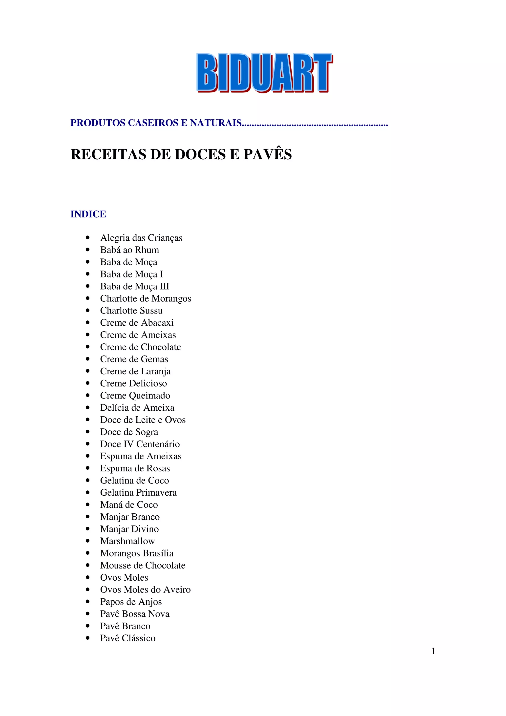 Este documento fornece receitas de doces e pavês caseiros, incluindo babás, cremes, charlottes e outros. Há mais de 30 receitas listadas no índice, com ingredientes e instruções de preparo para cada uma.