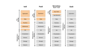 O documento discute abstração, evolução da virtualização e computação em nuvem, incluindo IaaS, PaaS e Docker. Ele também cobre tópicos como arquitetura Docker, escalabilidade, ferramentas Docker e modelos de entrega como FaaS e serverless.