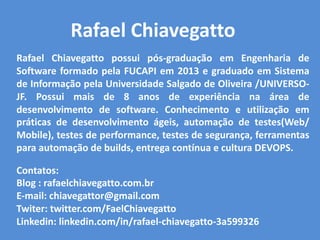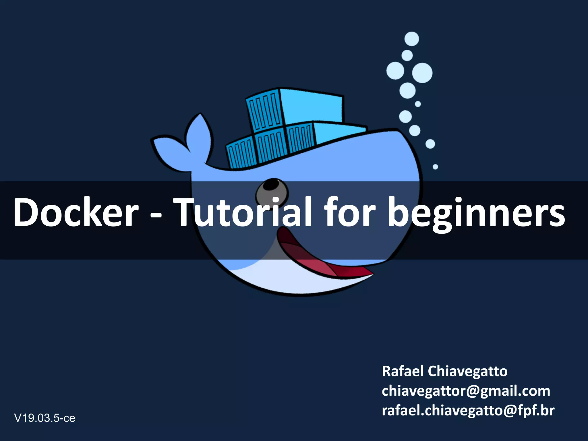 Rafael Chiavegatto apresenta um tutorial sobre Docker para iniciantes. O documento inclui informações sobre o próprio Rafael Chiavegatto, conceitos básicos de Docker como imagens, containers e Dockerfiles, demonstrações práticas de comandos Docker e uma seção sobre Docker Compose.