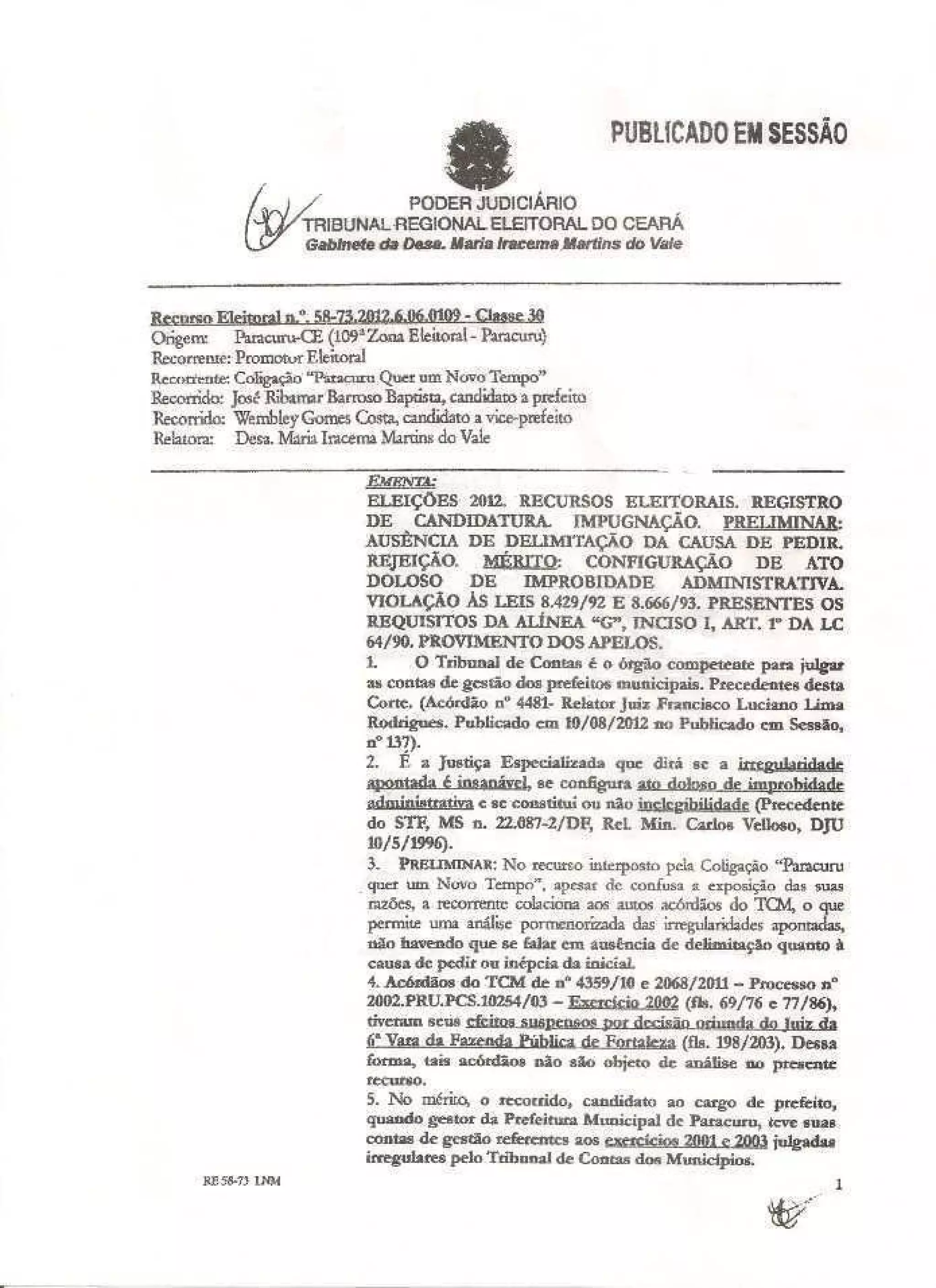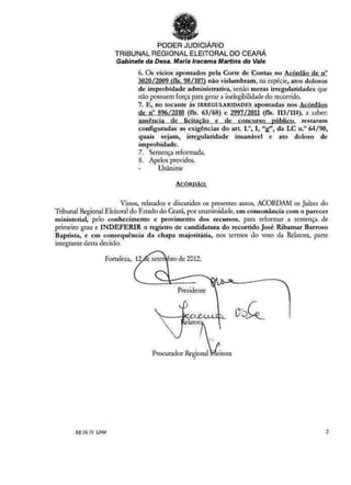 Este documento trata de um recurso eleitoral contra uma decisão que deferiu o registro de candidatura de José Ribamar Borroso Baptista. O Ministério Público Eleitoral alega que ele é inelegível por ter tido contas rejeitadas pelo Tribunal de Contas por irregularidades insanáveis configurando improbidade administrativa, como a ausência de licitação para contratações. O relator entende que as irregularidades apontadas pelo Tribunal de Contas são graves e insanáveis, caracterizando improbidade e ensejando a inelegibilidade prevista em le