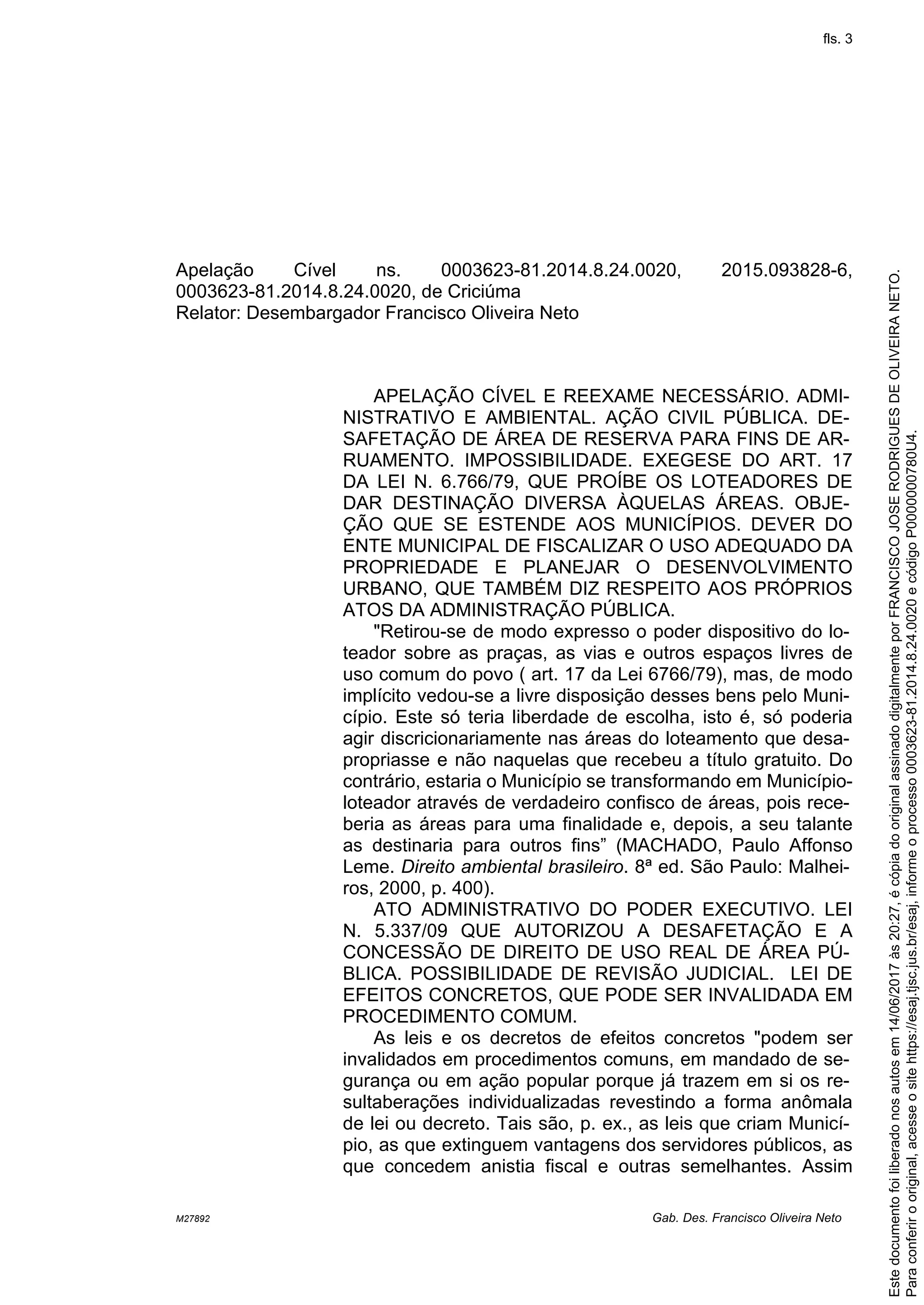 O documento trata de um caso de apelação cível sobre a desafetação de áreas de reserva para fins de arruamento realizada por um município. A sentença de primeira instância julgou parcialmente procedente o pedido do Ministério Público para declarar nula a desafetação e excluir o imóvel irregularmente desafetado de um negócio jurídico firmado entre os réus. Os réus apelaram sustentando não haver irregularidades. O relator propõe desprovimento dos recursos, entendendo ser possível estender aos