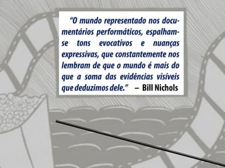 O documento aborda o conceito de documentário performático, destacando sua definição, surgimento e questões de subjetividade e identidade. Explora a sensibilidade emocional e o deslocamento entre real e imaginário, incluindo depoimentos que revelam a ausência de uma voz central. Além disso, menciona a dualidade entre diferentes mundos e outras fontes documentárias.