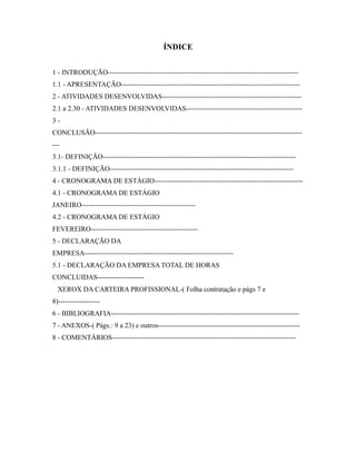 O documento apresenta o relatório de estágio de um estudante, com seções sobre introdução, atividades desenvolvidas, conclusão, cronograma de estágio, declaração da empresa, bibliografia e anexos.