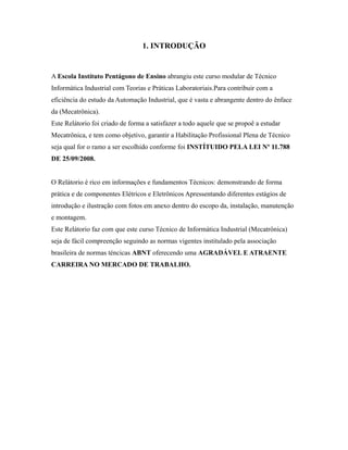 Este documento introduz um relatório sobre um curso técnico de informática industrial e mecatrônica oferecido por uma escola. O relatório fornece informações técnicas fundamentais sobre componentes elétricos e eletrônicos com fotos para garantir a qualificação profissional plena dos alunos de acordo com a lei, preparando-os para uma carreira atraente no mercado de trabalho.