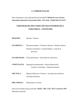 O documento descreve o cronograma de um curso técnico em informática industrial, incluindo as disciplinas de desenho, eletrônica, eletricidade, computação, mecânica e organização e normas. Ele também menciona a lei e regulamentos que regem o currículo.
