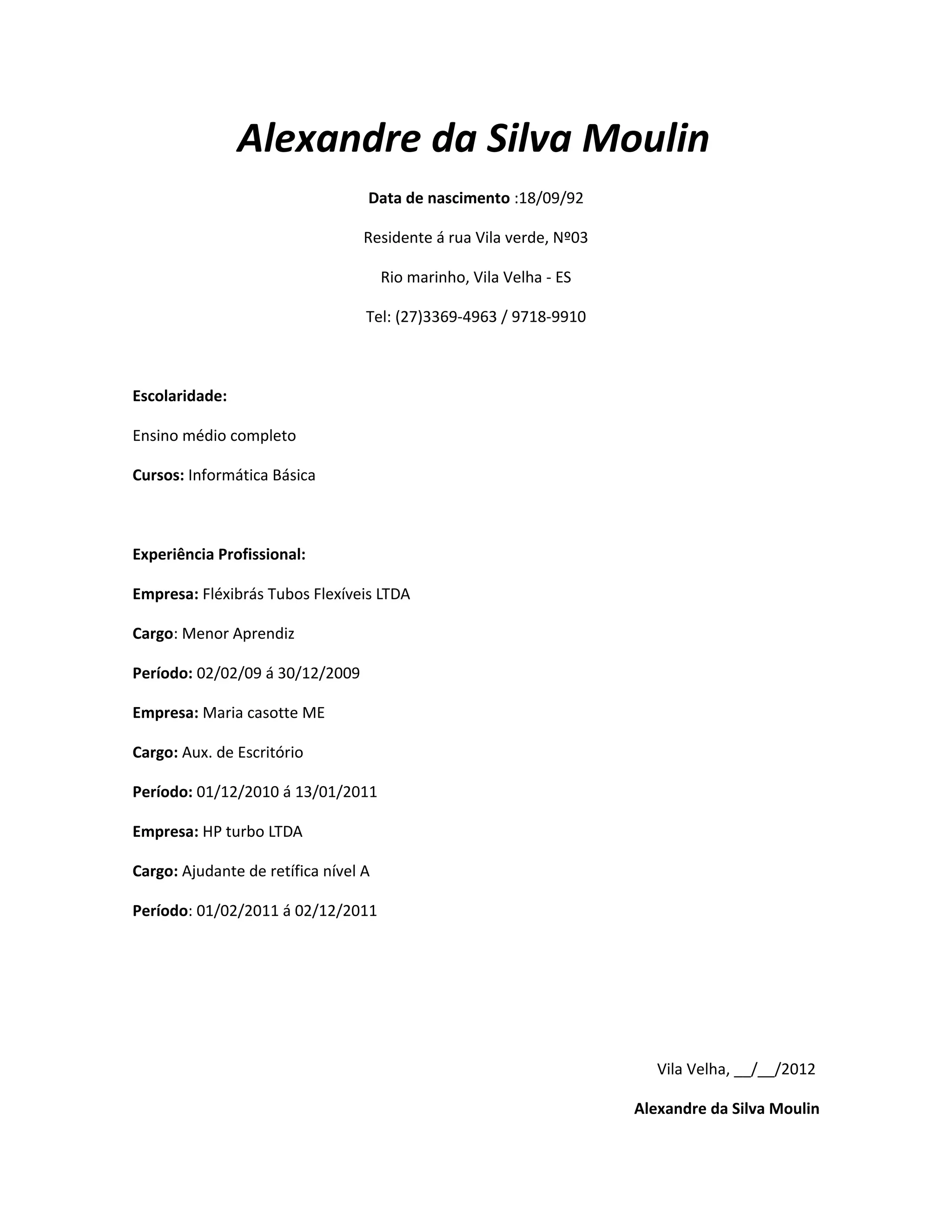 Este currículo apresenta os dados pessoais e a formação de Alexandre da Silva Moulin, nascido em 18/09/92 e residente em Vila Velha. Ele possui ensino médio completo e cursos em Informática Básica. Sua experiência profissional inclui cargos de Menor Aprendiz, Auxiliar de Escritório e Ajudante de Retífica em três empresas entre 2009 e 2011.