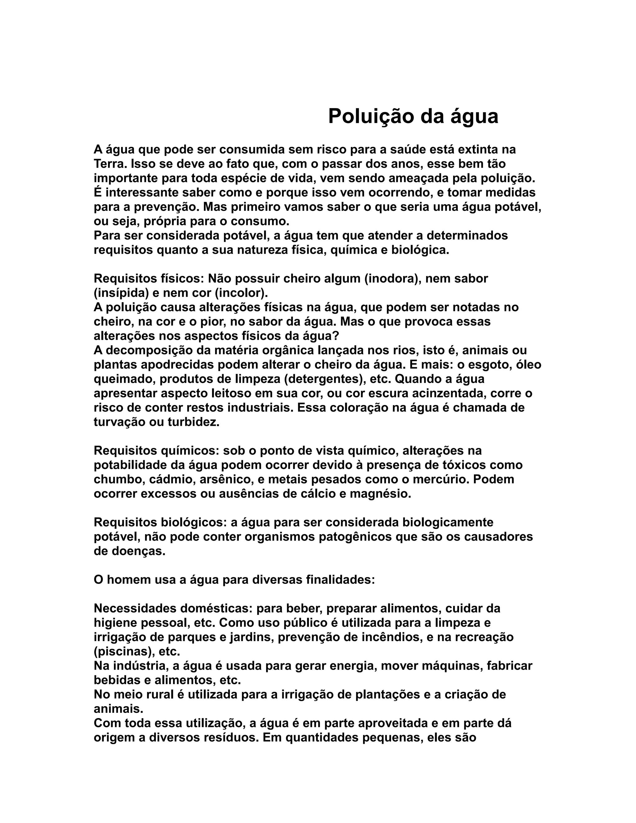 A água potável está extinta na Terra devido à poluição causada por esgotos domésticos e industriais, agrotóxicos, plásticos, solventes e compostos tóxicos lançados nos rios, lagos e mares. A poluição causa alterações físicas, químicas e biológicas na água que a tornam imprópria para consumo humano e ameaçam a vida vegetal e animal.