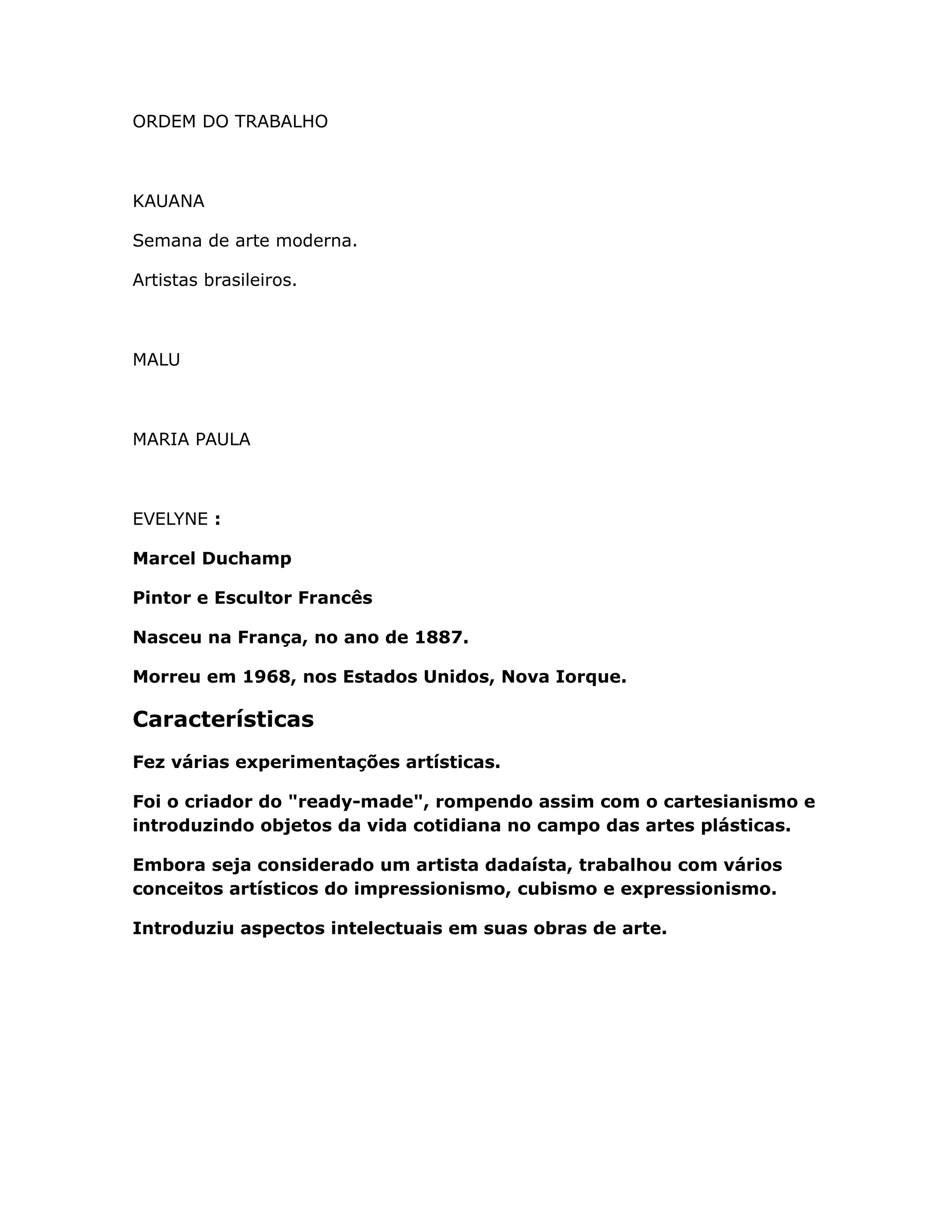 O documento apresenta informações biográficas e características artísticas de três artistas modernistas: o pintor e escultor francês Marcel Duchamp, conhecido por ter introduzido objetos cotidianos como obras de arte; o pintor, escultor e poeta franco-alemão Hans Arp, notável por seu trabalho abstrato e uso de colagem; e o filósofo, pintor e escritor italiano Julius Evola, influenciado inicialmente pelo futurismo plástico. A ordem do trabalho também lista outros nomes importantes da