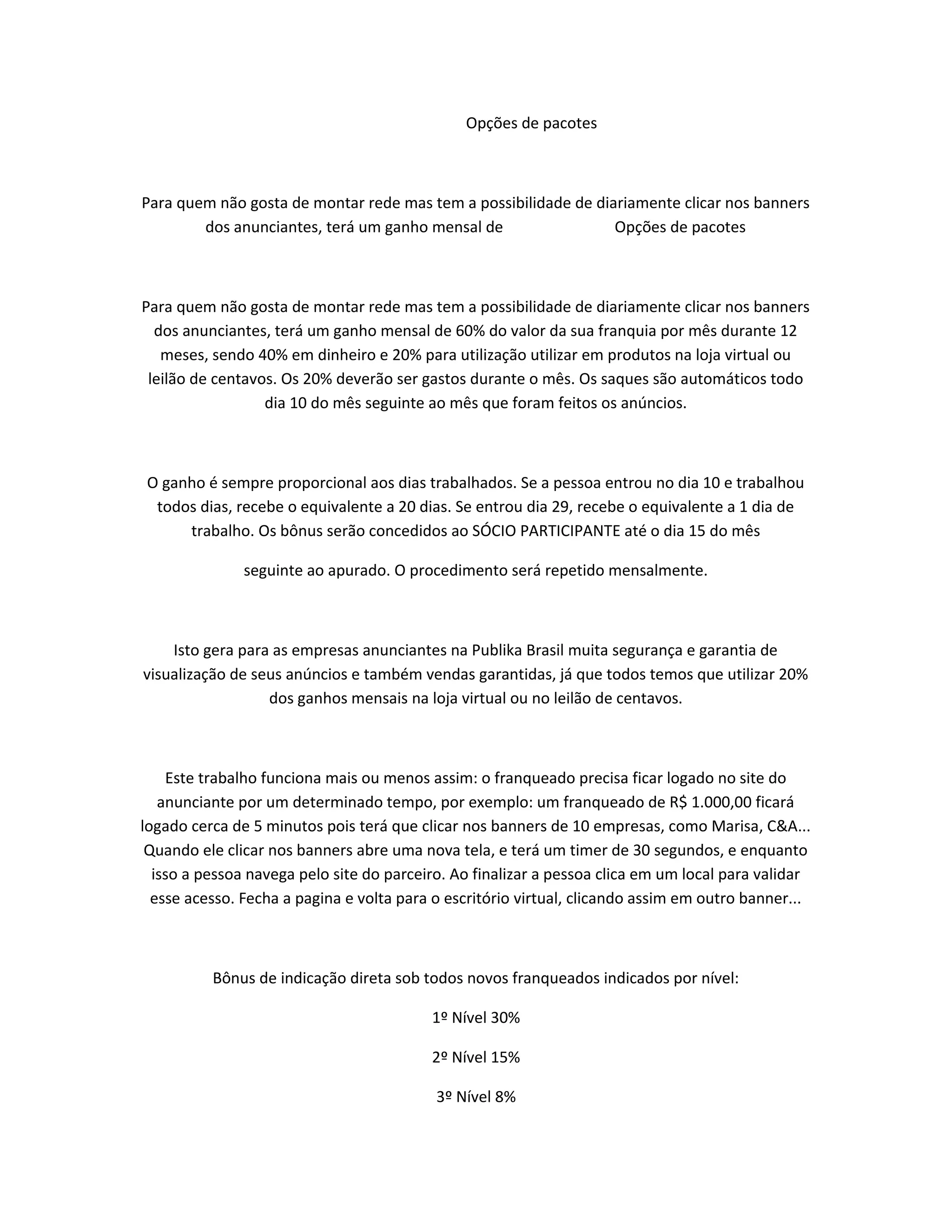 Pessoas que clicarem em banners diariamente receberão 60% do valor de sua franquia por mês durante 12 meses, sendo 40% em dinheiro e 20% para gastar em produtos. Os ganhos são proporcionais aos dias trabalhados. Há bônus para indicação de novos membros de acordo com os níveis da rede indicada.