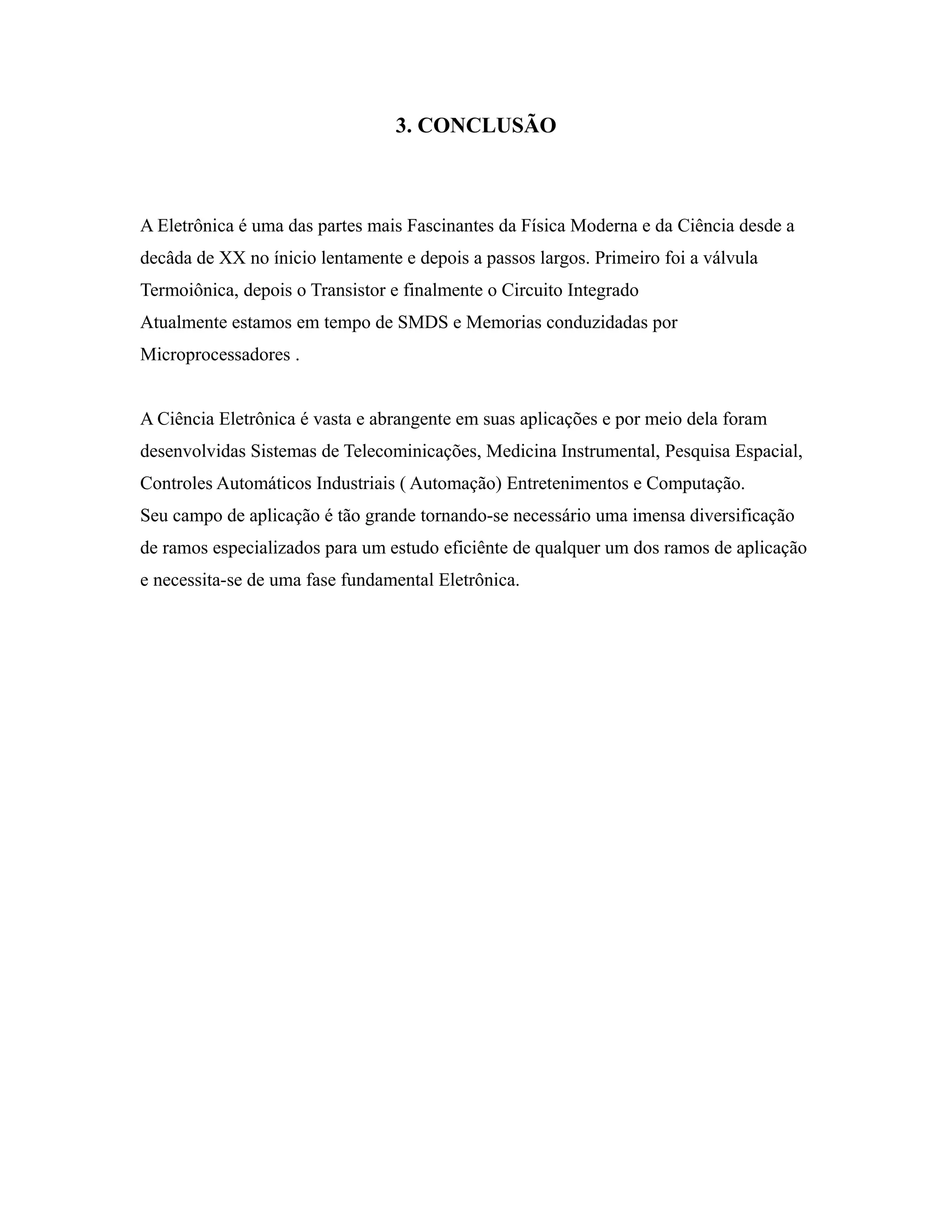 A eletrônica é uma parte fascinante da ciência moderna que evoluiu desde válvulas termoiônicas e transistores até circuitos integrados e microprocessadores. Sua aplicação é ampla em telecomunicações, medicina, espaço, automação, entretenimento e computação, requerendo especialização para estudar eficientemente cada ramo.