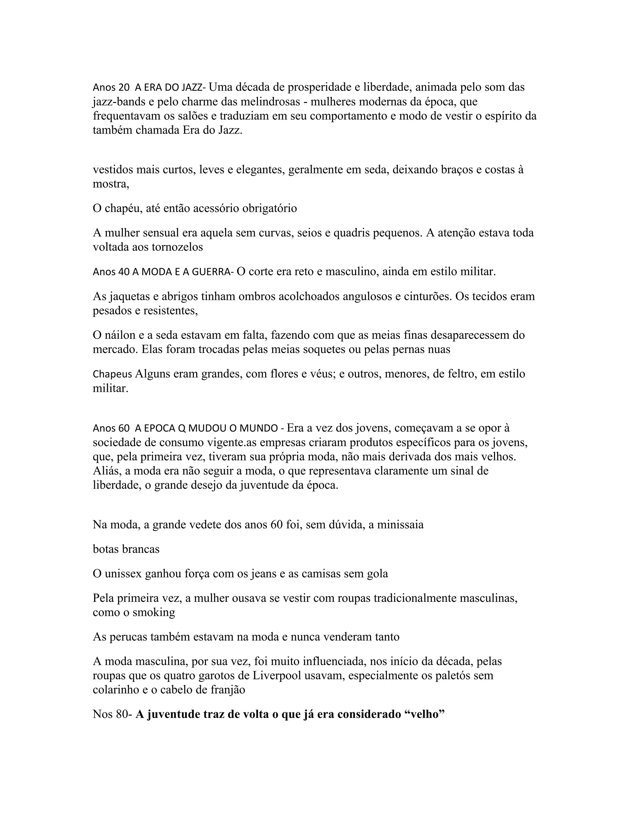 O documento descreve as tendências da moda em diferentes décadas do século XX e início do século XXI, incluindo os anos 20 caracterizados pelo jazz e vestidos curtos, os anos 40 pelo estilo militar durante a guerra, e os anos 60 pela minissaia e liberdade da juventude.