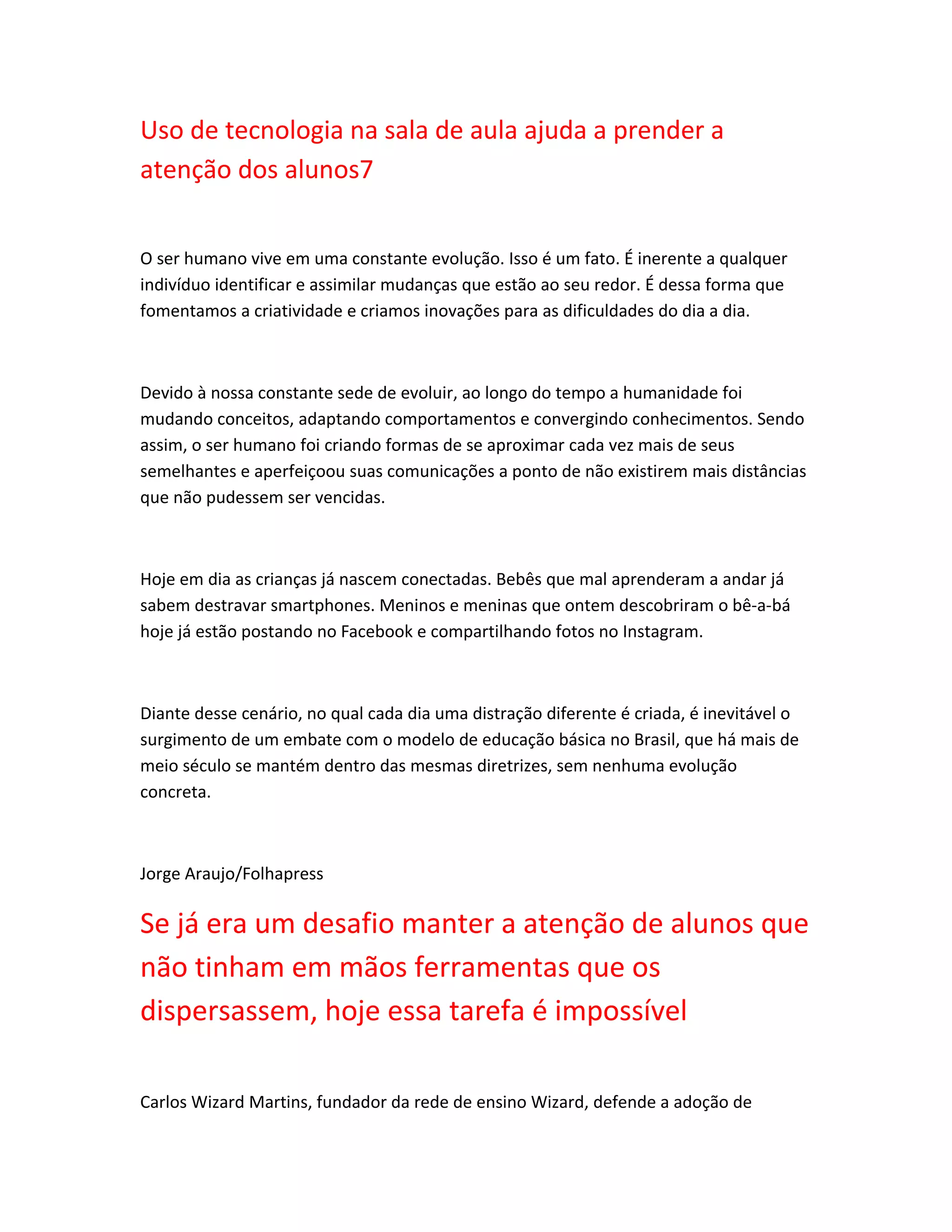 O documento discute a necessidade de incorporar tecnologia na educação brasileira para prender a atenção dos alunos e tornar o aprendizado mais envolvente. Defende que os métodos de ensino precisam se adaptar aos hábitos dos nativos digitais e proporcionar uma aprendizagem mais personalizada, lúdica e baseada em conceitos de gamificação e redes sociais. No entanto, reconhece que existem desafios burocráticos, estruturais e de desigualdade social que dificultam essa mudança.