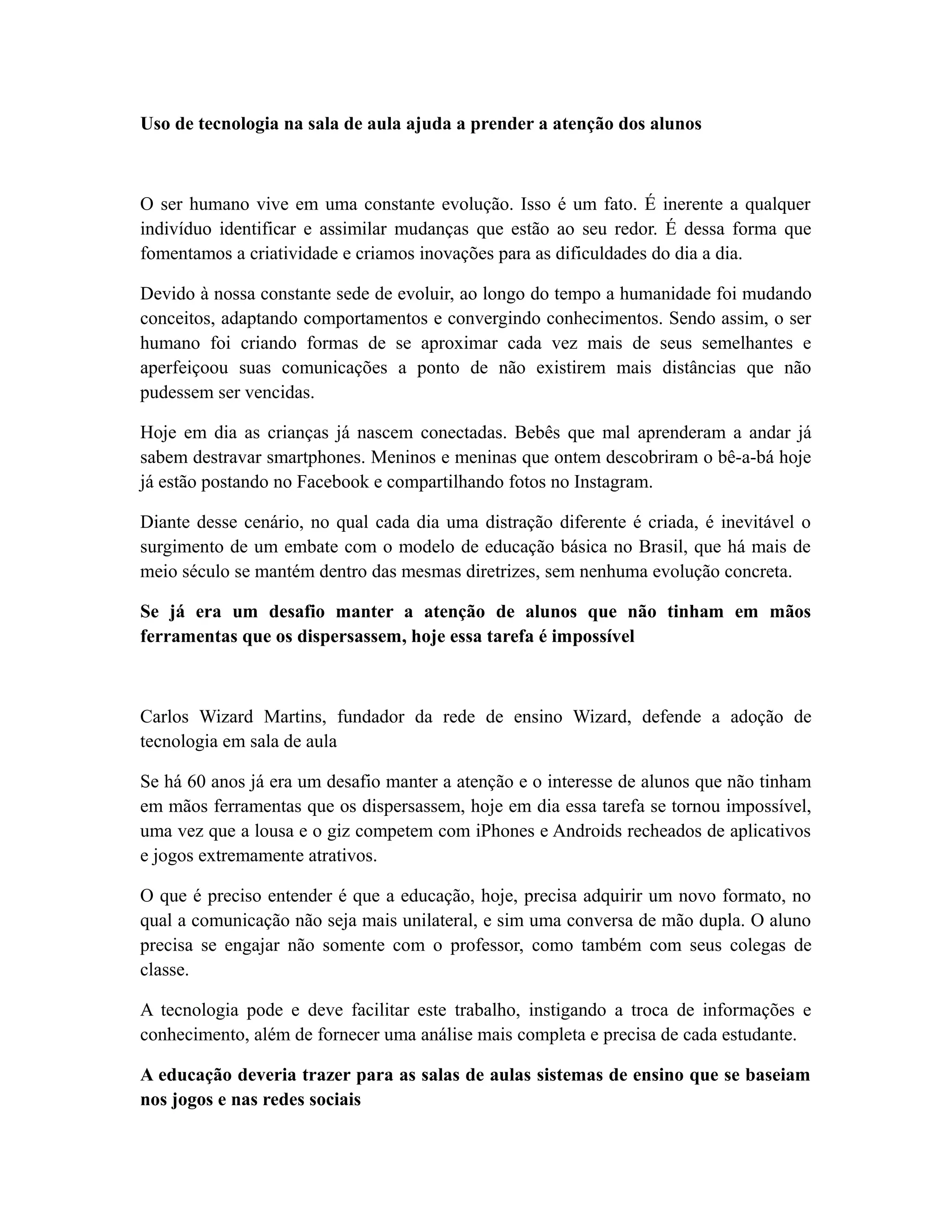 O documento discute a necessidade de incorporar mais tecnologia no ensino brasileiro para manter a atenção dos alunos. Carlos Wizard defende que as ferramentas digitais já fazem parte do cotidiano das crianças e que a educação precisa adotar novos formatos interativos e gamificados para engajar os estudantes. Entretanto, reconhece que mudanças estruturais são necessárias para superar barreiras burocráticas e levar tecnologia a todas as escolas.