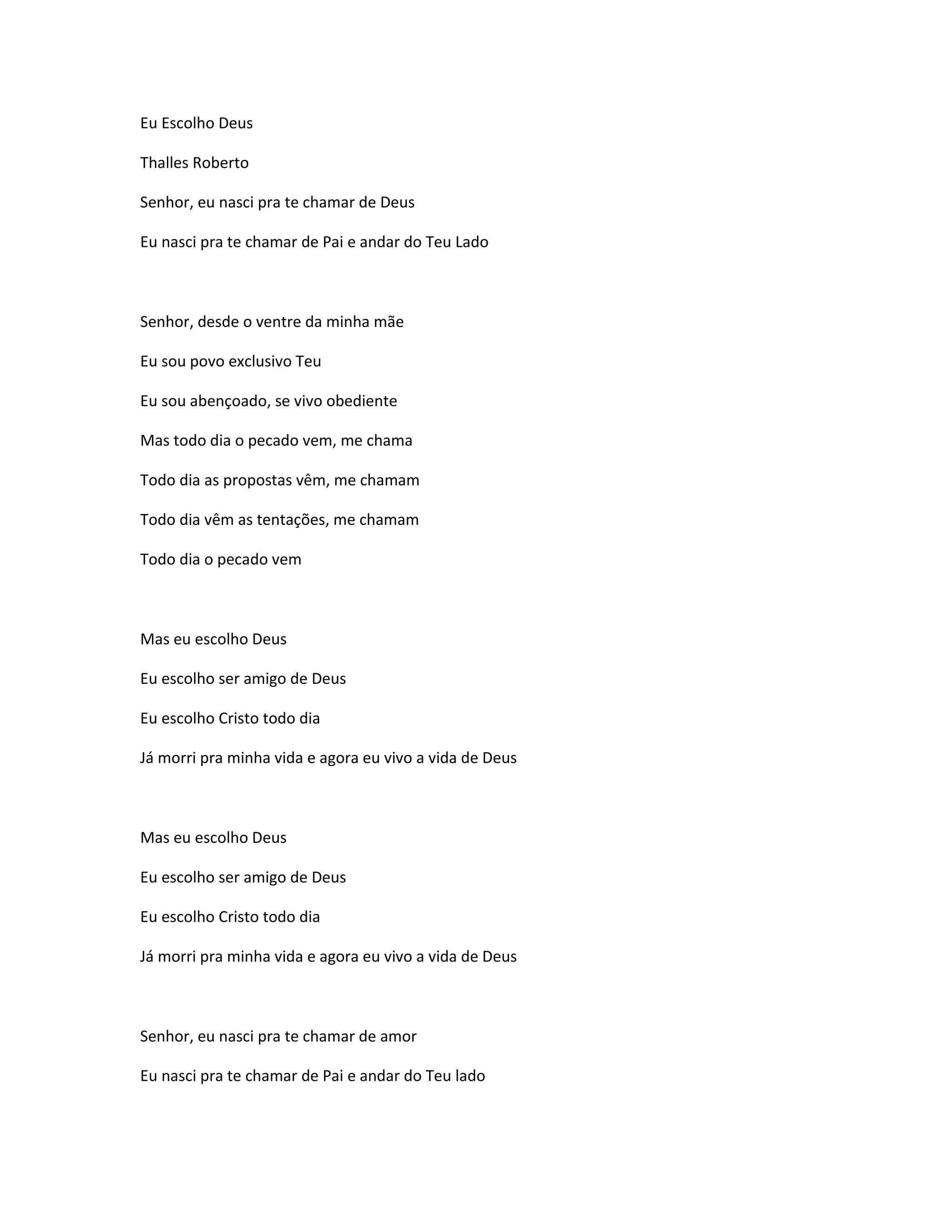 O documento descreve a escolha do autor por Deus e Cristo apesar das tentações diárias do pecado. Ele canta sobre ter nascido para chamar Deus de amor e pai e andar ao lado dele. Apesar das tentações, ele escolhe Deus, ser amigo de Deus e viver a vida de acordo com Deus.
