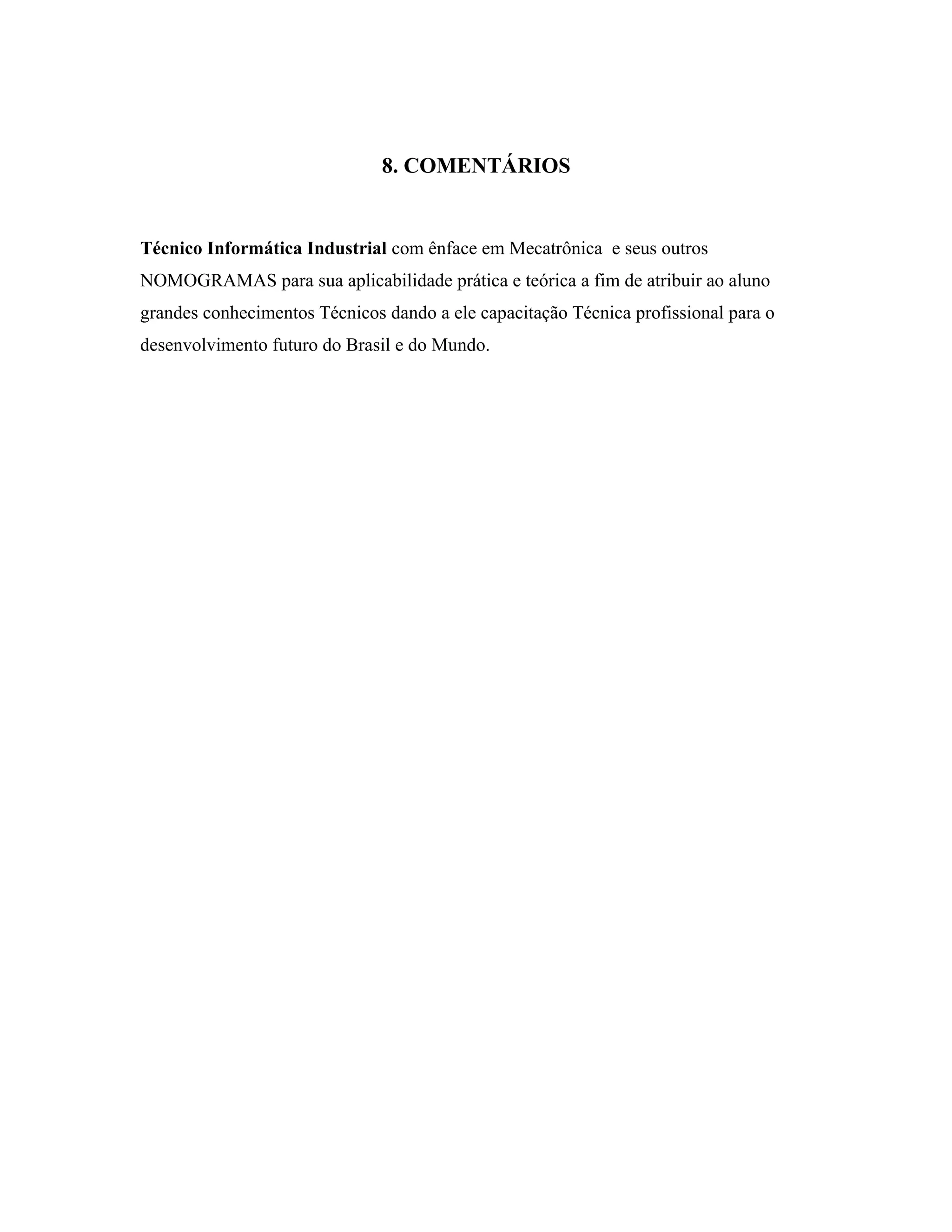 O documento discute a importância de ensinar técnicas de mecatrônica e nomogramas aos alunos para que eles possam adquirir conhecimentos técnicos e capacitação profissional, contribuindo para o desenvolvimento do Brasil e do mundo.