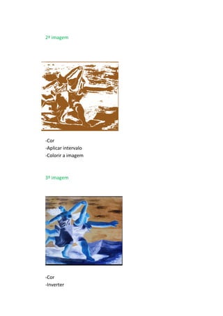 O documento descreve exercícios de edição e manipulação de imagens no GIMP, incluindo aplicar cores e filtros artísticos em imagens, recortar cuidadosamente detalhes e movê-los, e adicionar texto. Os exercícios ensinam várias técnicas como inverter cores, aplicar efeitos de luz e sombra, e transformar e rotacionar imagens.